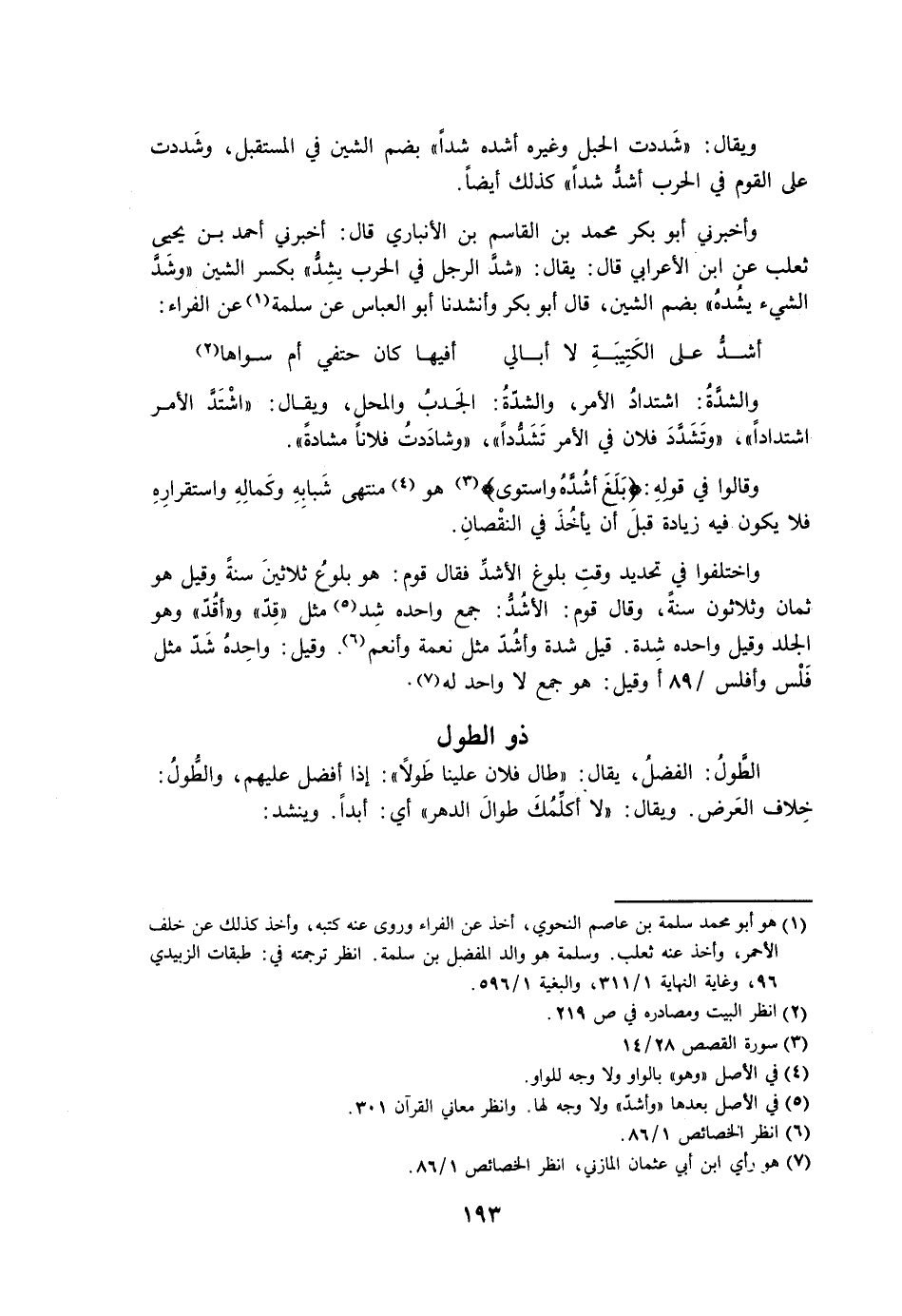 وأخبرني أبو بكر محمد بن القاسم بن الأنباري قال: أخبرني أحمد بن يحيى ثعلب عن ابن الأعرابي قال: يقال: «شد الرجل في الحرب يشد» بكسر الشين «وشد الشيء يشده» بضم الشين، قال أبو بكر وأنشدنا أبو العباس عن سلمة عن الفراء: