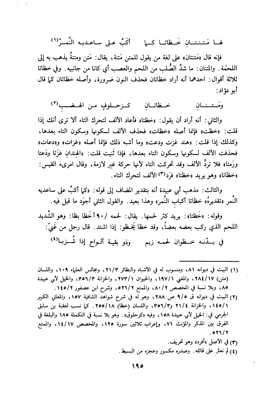 فإنه قال «متنتان» على لغة من يقول للمتن متنة، يقال: متن ومتنة يذهب به إلى اللحمة. والمتنان: ما شد الصلب من اللحم والعصب أي كانا من جانبيه. وفي خظاتا ثلاثة أقوال: أحدهما أنه أراد خظاتان فحذف النون ضرورة، وأصله خظاتان كما قال أبو دؤاد: