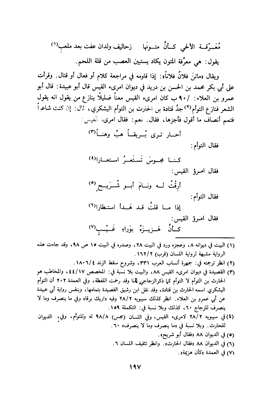 ويقال «ماتن فلان فلانًا»: إذا قاومه في مراجعة كلام أو فعال أو قتال. وقرأت على أبي بكر محمد بن الحسن بن دريد في ديوان امرئ القيس قال أبو عبيدة: قال أبو عمرو بن العلاء: كان امرئ القيس معنًا ضليلاً ينازع من يقول إنه يقول الشعر فنازع التوأم جد قتادة بن الحارث بن التوأم اليشكري، قال: إن كنت شاعرًا فتمم أنصاف ما أقول فأجزها، فقال: نعم: فقال امرئ القيس: