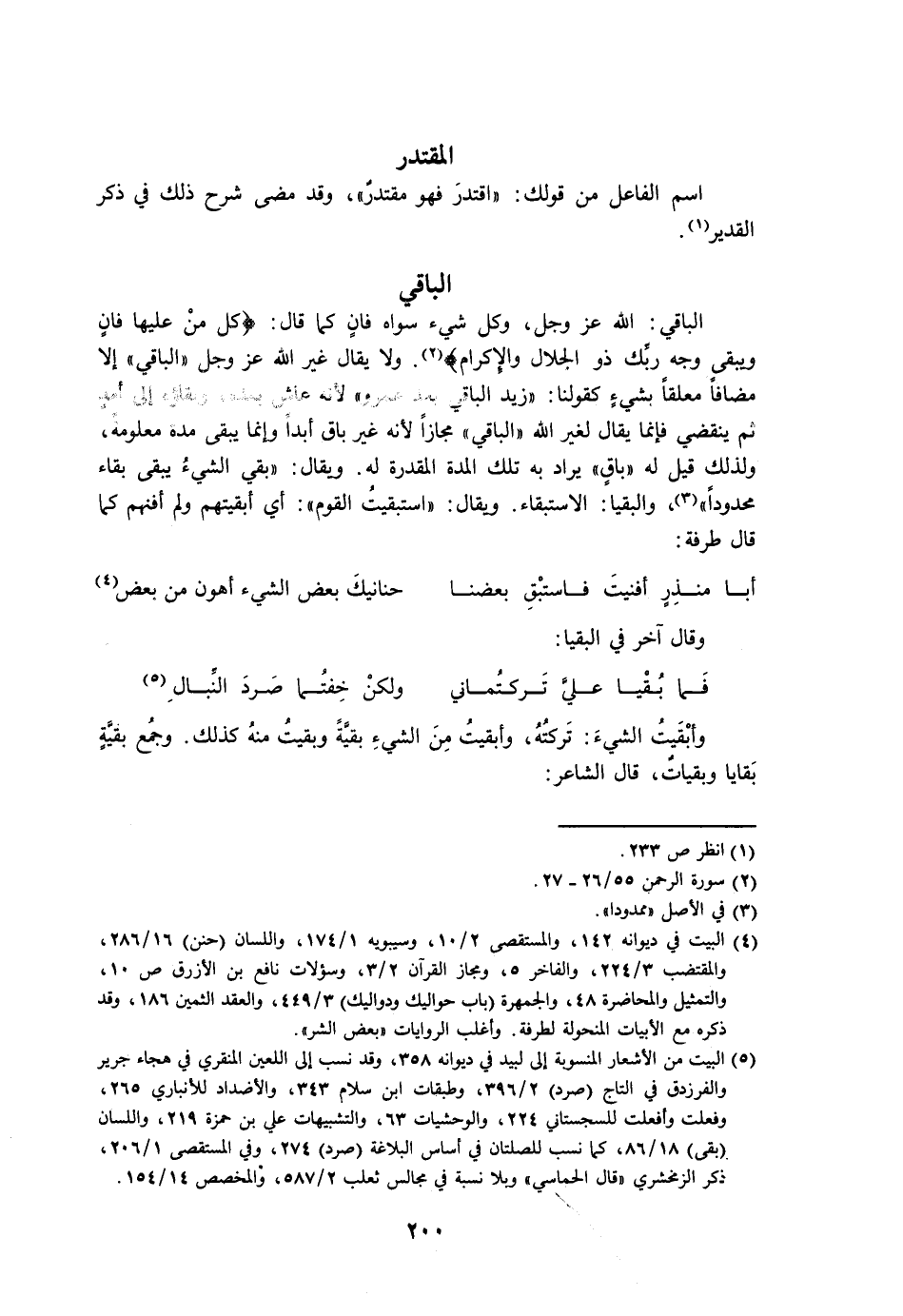 الباقي: الله عز وجل، وكل شيء سواه فإن كما قال: {كل من علهيا فان ويبقى وجه ربك ذو الجلال والإكرم}. ولا يقال غير الله عز وجل «الباقي» إلا مضافًا معلقًا بشيء كقولنا: «زيد الباقي بعد عمرو» لأنه عاش بعده وبقاؤه إلى أمد ثم ينقضي فإنما يقال لغير الله «الباقي» مجازًا لأنه غير باق أبدًا وإنما يبقى مدة معلومة، ولذلك قيل له «باقٍ» يراد به تلك المدة المقدرة له. ويقال: «بقي الشيء يبقى بقاء محدودًا»، والبقيا: الاستبقاء. ويقال: «استبقيت القوم»: أي أبقيتهم ولم أفنهم كما قال طرفة:
