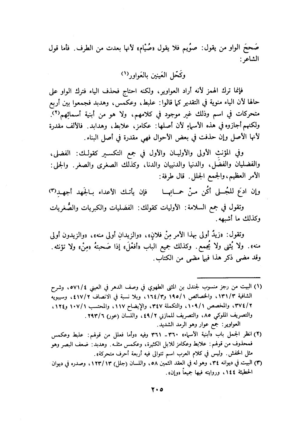 فإنما ترك الهمز لأنه أراد العواوير، ولكنه احتاج فحذف الياء فترك الواو على حالها لأن الياء منوية في التقدير كما قالوا: علبط، وعكمس، وهدبد فجمعوا بين أربع متحركات في اسم وذلك غير موجود في كلامهم، ولا هو من أبنية أسمائهم. ولكنهم أجازوه في هذه الأسماء لأن أصلها: عكامز، علابط، وهدابد. فالألف مقدرة لأنها الأصل وإن حذفت في بعض الأحوال فهي مقدرة في أصل البناء.