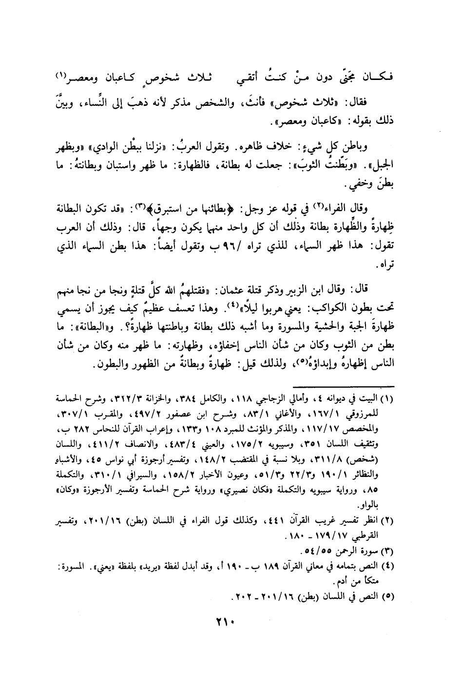 قال: وقال ابن الزبير وذكر قتلة عثمان: «فقتلهم الله كل قتلة ونجا من نجا منهم تحت بطون الكواكب: يعني هربوا ليلا». وهذا تعسف عظيم كيف يجوز أن يسمي ظهارة الجبة والحشية والمسورة وما أشبه ذلك بطانة وباطنتها ظهارة؟. و «البطانة»: ما بطن من الثوب وكان من شأن الناس إخفاؤه، وظهارته: ما ظهر منه وكان من شأن الناس إظهاره وإبداؤه، ولذلك قيل: ظهارة وبطانة من الظهور والبطون».