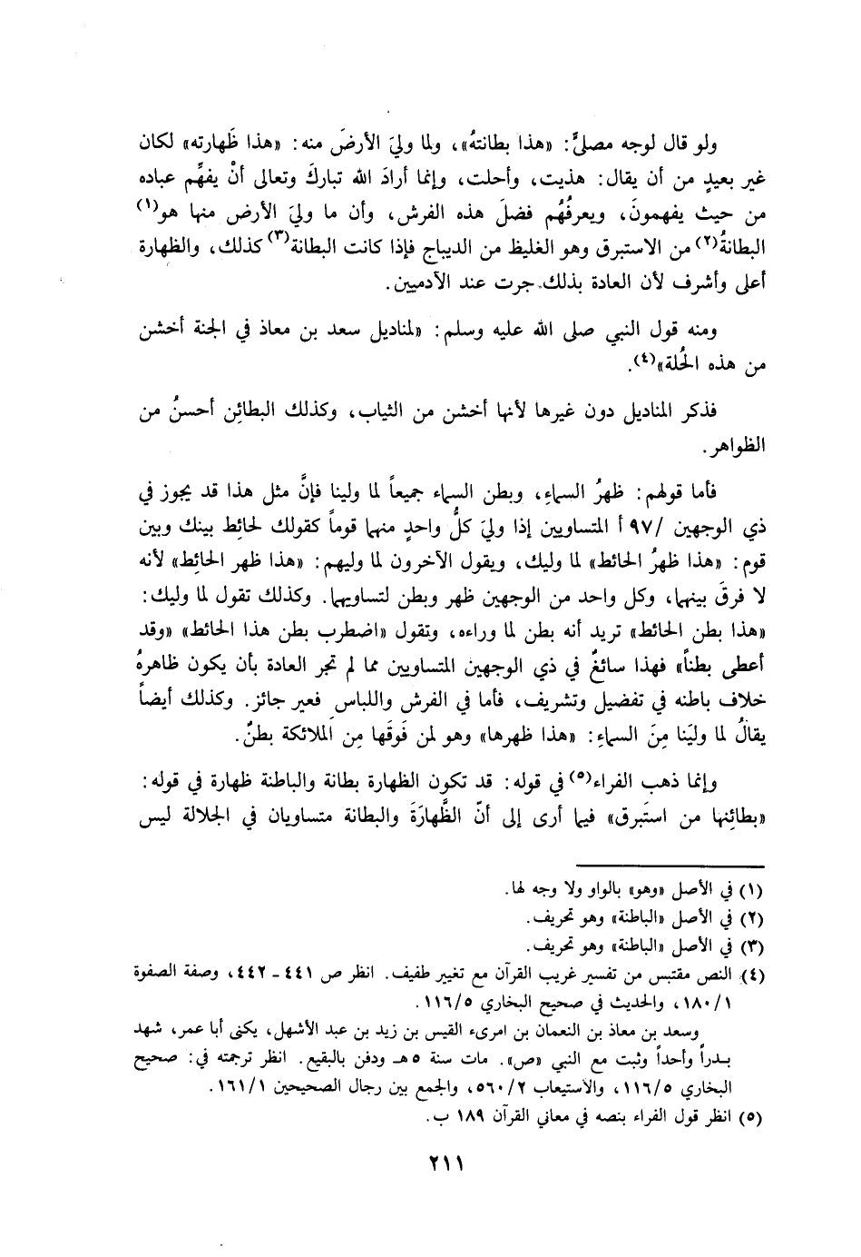 وإنما ذهب الفراء في قوله: قد تكون الظهارة بطانة والباطنة ظهارة في قوله: «بطائنها من استبرق» فيما أرى إلى أن الظهارة والبطانة متساويان في الجلالة ليس