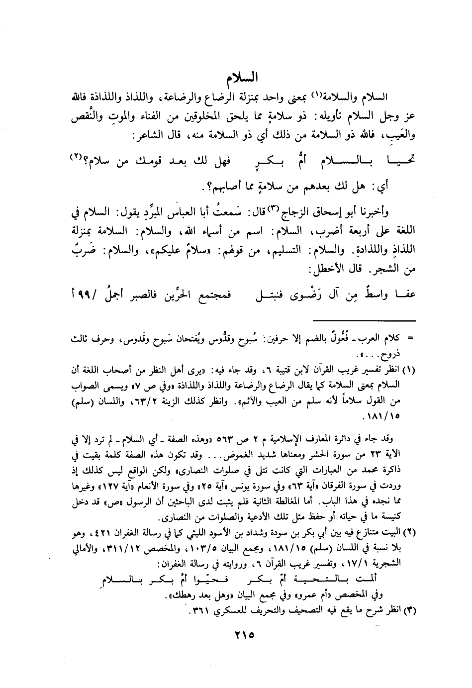 وأخبرنا أبو إسحاق الزجاج قال: سمعت أبا العباس المبرد يقول: السلام في اللغة على أربعة أضرب، السلام: اسم من أسماء الله، والسلام: السلامة بمنزلة اللذاذا واللذاذاة. والسلام: التسليم، من قولهم: «سلام عليكم»، والسلام: ضرب من الشجر. قال الأخطل: