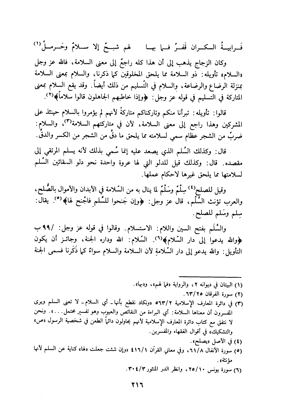 وكان الزجاج يذهب إلى أنه كله راجع إلى معنى السلامة، فالله عز وجل «السلام» تأويله: ذو السلامة مما يلحق المخلوقين كما ذكرنا، والسلام بمعنى السلامة بمنزلة الرضاع والرضاعة، والسلام في التسليم من ذلك أيضًا. وقد يقع السلام بمعنى المتاركة في التسليم في قوله عز وجل: {وإذا خاطبهم الجاهلون قالوا سلاما}.