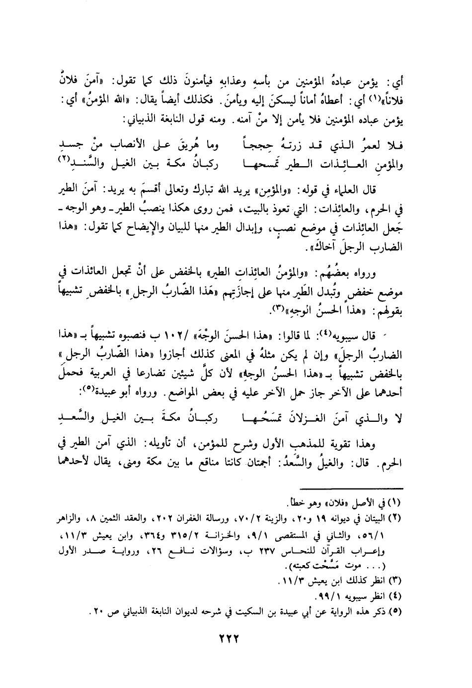 قال العلماء في قوله: «والمؤمن» يريد الله تبارك وتعالى أقسم به يريد: آمن الطير في الحرم، والعائذات: التي تعوذ بالبيت، فمن روى هكذا ينصب الطير - وهو الوجه - جعل العائذات في موضع نصب، وإبدال الطير منها للبيان والإيضاح كما تقول: «هذا الضارب الرجل آخاك».