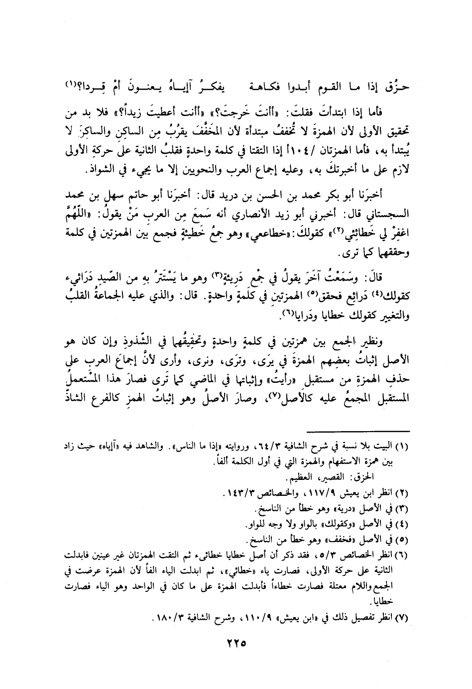 ونظير الجمع بين همزتين في كلمة واحدة وتحقيقهما في الشذوذ وإن كان هو الأصل إثبات بعضهم الهمزة في يرى، وترى، ونرى، وأرى لأن إجماع العرب على حذف الهمزة من مستقبل «رأيت» وإثباتها في الماضي كما ترى فصار هذا المستعمل المستقبل المجمع عليه كالأصل، وصار الأصل وهو إثبات الهمز كالفرع الشاذ