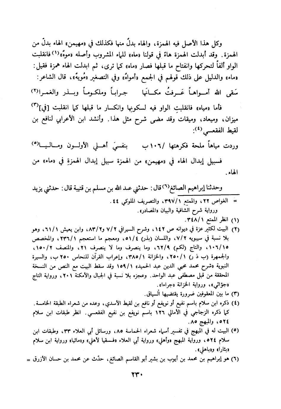 وكل هذا الأصل فيه الهمزة، والهاء بدل منها فكذلك في «مهيمن» الهاء بدل من الهمزة. وقد بدأت الهمزة هاء في قولنا «ماه» للماء المشروب وأصله «موه» فانقلبت الواو ألفًا لتحركها وانفتاح ما قبلها فصار «ماه» كما ترى، ثم ابدلت الهاء همزة فقيل: «ماء» والدليل على ذلك قولهم في الجمع «أمواه» وفي التصغير «مويه»، قال الشاعر: