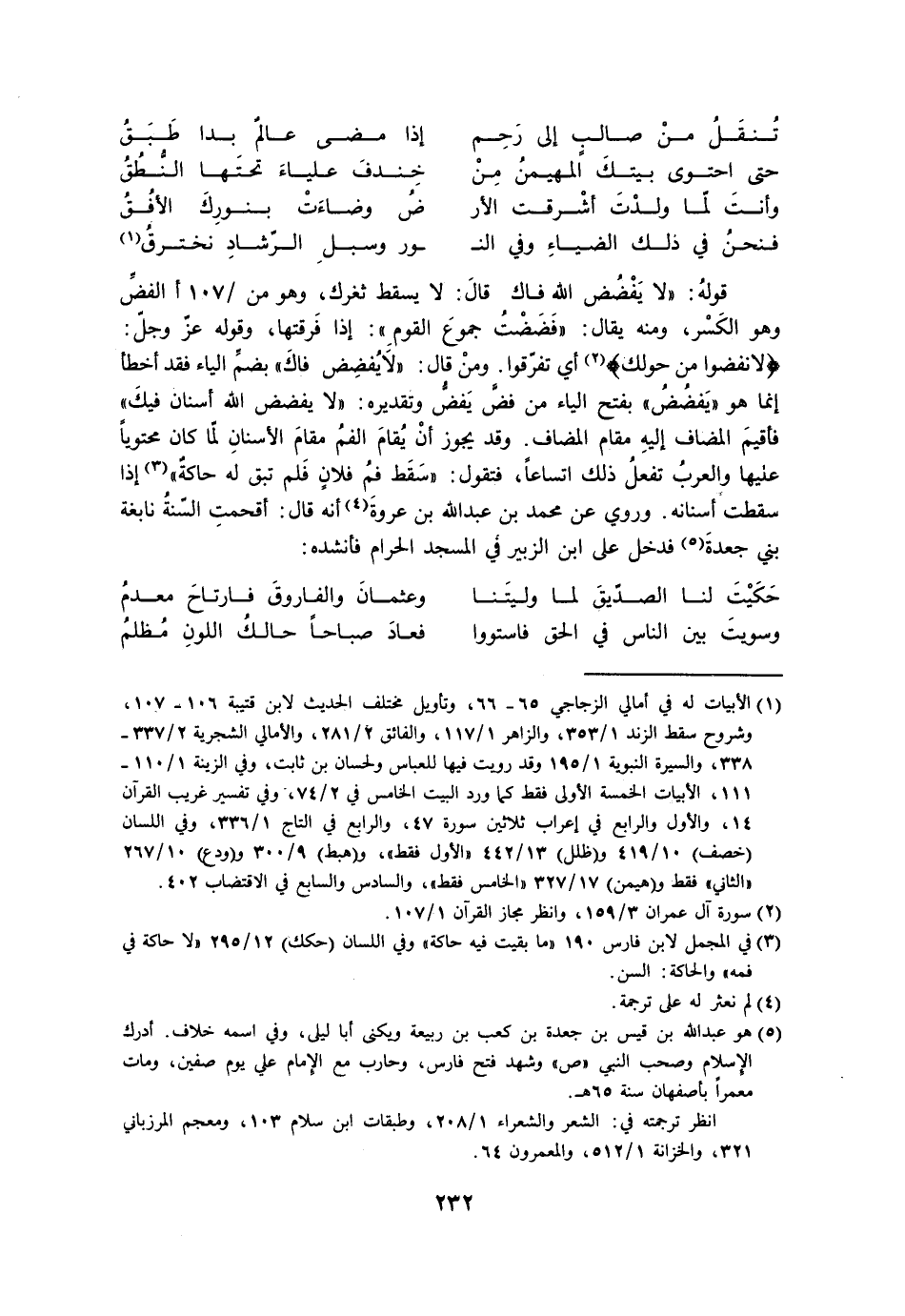 قوله: «لا يفضض الله فاك قال: لا يسقط ثغرك، وهو من الفض وهو الكسر، ومنه يقال: «فضضت جموع القوم»: إذا فرقتها، وقوله عز وجل: {لانفضوا من حولك} أي تفرقوا. ومن قال: «لا يفضض فاك» بضم الياء فقد أخطأ إنما هو «يفضض» بفتح الياء من فض يفض وتقديره: «لا يفضض الله أسنان فيك» فأقيم المضاف إليه مقام المضاف. وقد يجوز أن يقام الفم مقام الأسنان لما كان محتويًا عليها والعرب تفعل ذلك اتساعًا، فتقول: «سقط فم فلان فلم تبق له حاكة» إذا سقطت أسنانه. وروي عن محمد بن عبد الله بن عروة أنه قال: أقحمت السنة نابغة بني جعدة فدخل علي بن الزبير في المسجد الحرام فأنشده: