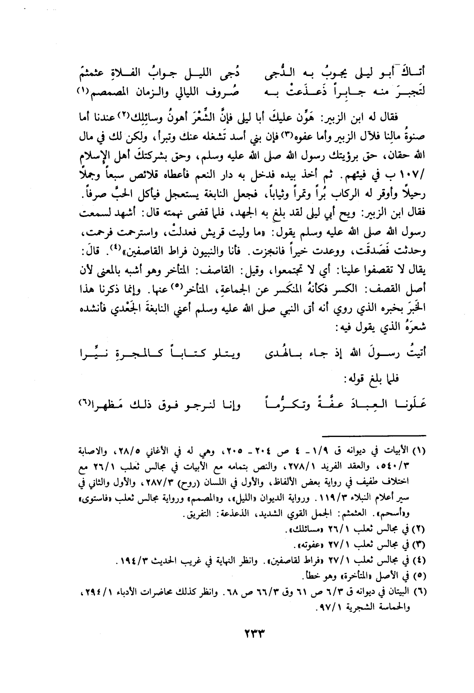 فقال له ابن الزبير: هون عليك أبا ليلى فإن الشعر أهون وسائلك عندنا أما صنوة مالنا فلآل الزبير وأما عفوه فإن بني أسد تشغله عنك وتبرأ، ولكن لك في مال الله حقان، حق برؤيتك رسول الله صلى الله عليه وسلم، وحق بشركتك أهل الإسلام في فيئهم. ثم أخذ بيده فدخل به دار النعم فأعطاه قلائص سبعًا وجملاً رحيلاً وأوقر له الركاب برًا وتمرًا وثيابًا، فجعل النابغة يستعجل فيأكل الحب صرفًا. فقال ابن الزبير: ويح أبي ليلى لقد بلغ به الجهد، فلما قضى نهمته قال: أشهد لسمعت رسول الله صلى الله عليه وسلم يقول: «ما وليت قريش فعدلت، واسترحمت فرحمت، وحدثت فصدقت، ووعدت خيرًا فأنجزت. فأنا والنبيون فراط القاصفين». قال: يقال لا تقصفوا علينا: أي لا تجتمعوا، وقيل: القاصف: المتأخر وهو أشبه بالمعنى لأن أصل القصف: الكسر فكأنه المنكسر عن الجماعة، المتأخر عنها. وإنما ذكرنا هذا الخبر بخبره الذي روي أنه أتى النبي صلى الله عليه وسلم أعني النابغة الجعدي فأنشده شعره الذي يقول فيه: