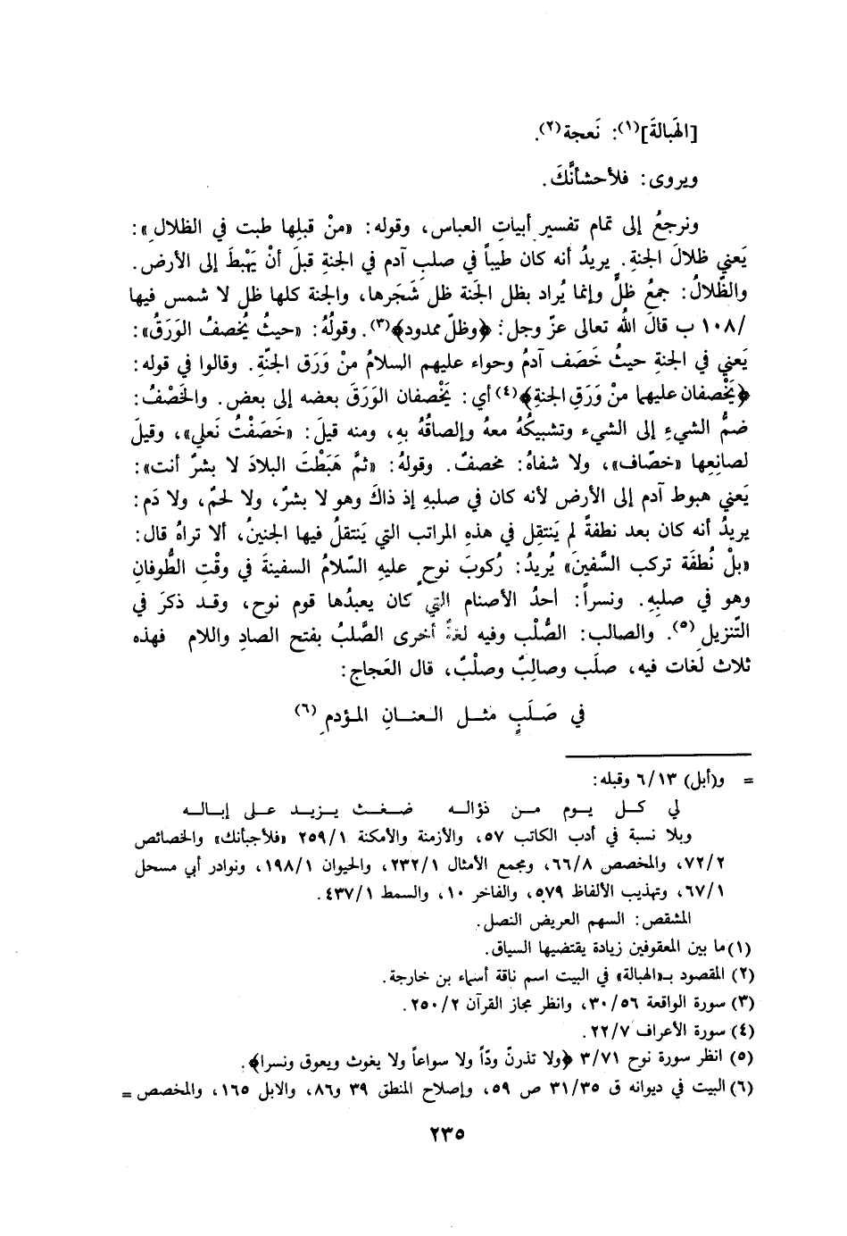 ونرجع إلى تمام تفسير أبيات العباس، وقوله: «من قبلها طبت في الظلال»: يعني ظلال الجنة. يريد أنه كان طيبًا في صلب آدم في الجنة قبل أن يهبط إلى الأرض. والظلال: جمع ظل وإنما يراد بظل الجنة ظل شجرها، والجنة كلها ظل لا شمس فيها قال الله تعالى عز وجل: {وظل ممدود}. وقوله: «حيث يخصف الورق»: يعني في الجنة حيث خصف آدم وحواء عليهم السلام من ورق الجنة. وقالوا في قوله: {يخصفان عليهما من ورق الجنة} أي: يخصفان الورق بعضه إلى بعض. والخصف: ضم الشيء إلى الشيء وتشبيكه معه وإلصاقه به، ومنه قيل: «خصفت نعلي»، وقيل لصانعها «خصاف»، ولا شفاه: مخف. وقوله: «ثم هبطت البلاد لا بشر أنت»: يعني هبوط آدم إلى الأرض لأنه كان في صلبه إذ ذاك وهو لا بشر، ولا لحم، ولا دم: يريد أنه كان بعد نطفة لم ينتقل في هذا المراتب التي ينتقل فيها الجنين، ألا تراه قال: «بل نطفة تركب السفين» يريد: ركوب نوح عليه السلام السفينة في وقت الطوفان وهو صلبه. ونسرًا: أحد الأصنام التي كان يعبدها قوم نوح، وقد ذكر في التنزيل. والصالب: الصلب وفيه لغة أخرى الصلب بفتح الصاد واللام فهذه ثلاثة لغات فيه، صلب وصالب وصلب، قال العجاج: