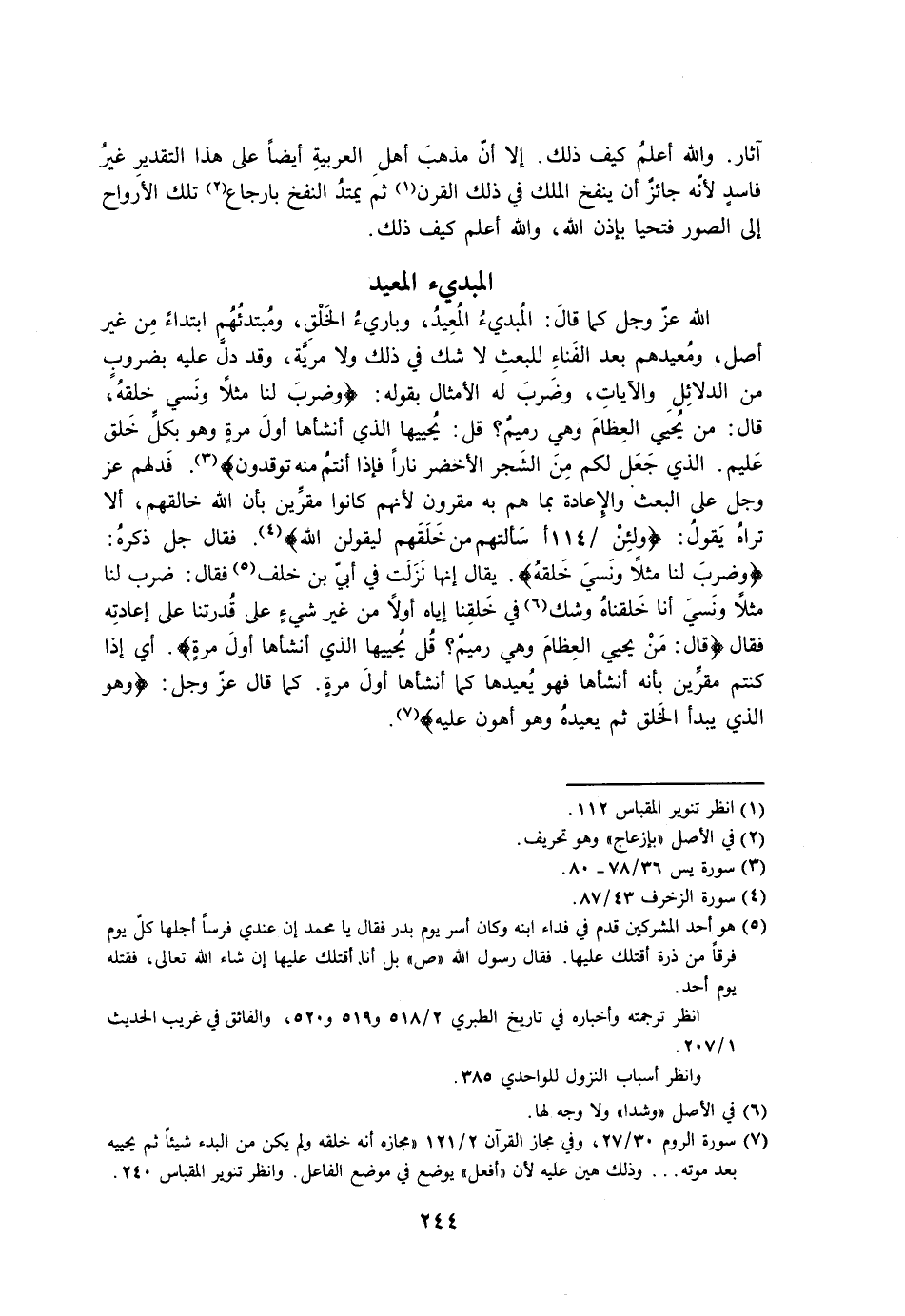 الله عز وجل كما قال: المبدئ المعيد، وبارئ الخلق، ومبتدئهم ابتداءً من غير أصل، ومعيدهم بعد الفناء للبعث لا شك في ذلك ولا مرية، وقد دل عليه بضروب من الدلائل والآيات، وضرب له الأمثال بقوله: {وضرب لنا مثلا ونسي خلقه، قال: من يحيي العظام وهي رميم؟ قال: يحييها الذي أنشأها أول مرة وهو بكل خلق عليم. الذي جعل لكم من الشجر الأخضر نارًا فإذا أنتم منه توقدون}. فدلهم عز وجل على البعث والإعادة بما هم به مقرون لأنهم كانوا مقرين بأن الله خالقهم، ألا تراه يقول: {ولئن سألتهم من خلقهم ليقولن الله}. فقال جل ذكره: {وضرب لنا مثلاً ونسي خلقه}. يقال إنها نزلت في أبي بن خلف فقال: ضرب لنا مثلاً ونسي أنا خلقناه وشك في خلقنا إياه أولاً من غير شيء على قدرتنا على إعادته فقال «قال: من يحيي العظام وهي رميم؟ قل يحييها الذي أنشأها أول مرة». أي إذا كنتم مقرين بأنه أنشأها فهو يعيدها كما أنشأها أول مرة. كما قال عز وجل: {وهو الذي يبدأ الخلق ثم يعيده وهو أهون عليه}.