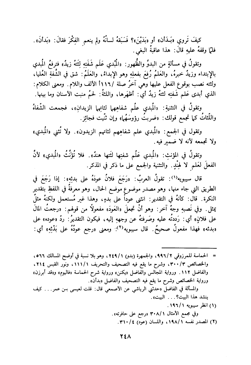 وتقول في الجمع: «المبدي علم شفاهم لثاتهم الزيدون». ولا تثني «المبدي» ولا تجمعه لأنه لا ضمير فيه.