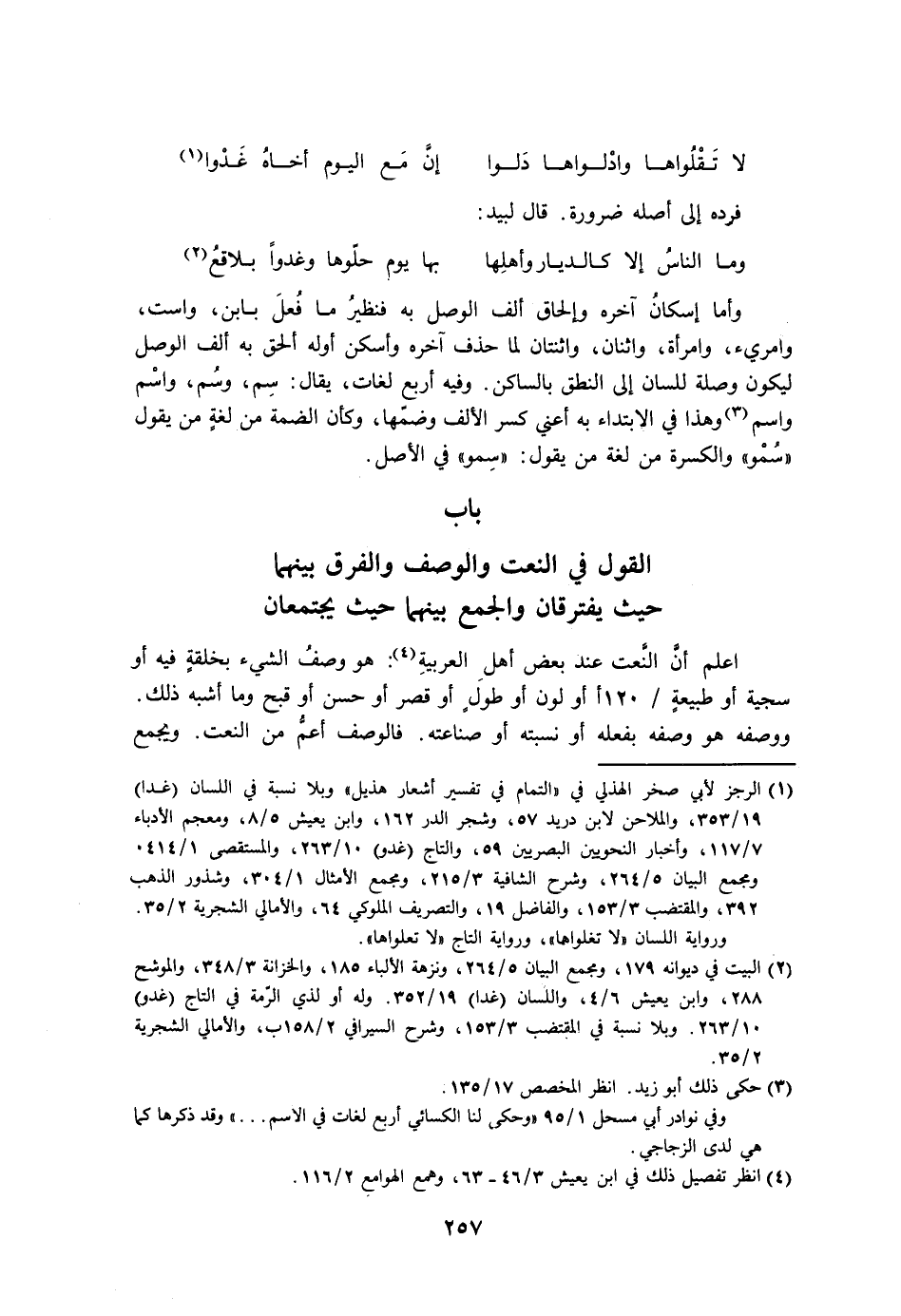 اعلم أن النعت عند بعض أهل العربية: هو وصف الشيء بخلقة فيه أو سجية أو طبيعة أو لون أو طول أو قصر أو حسن أو قبح وما أشبه ذلك. ووصفه هو وصفه بفعله أو نسبته أو صناعته. فالوصف أعم من النعت. ويجمع