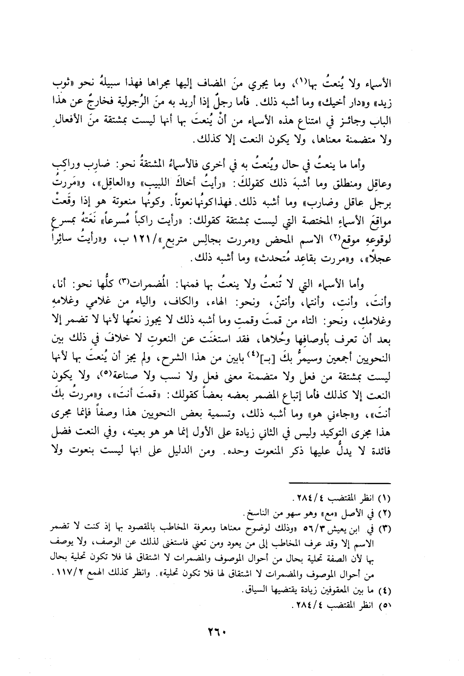 الأسماء ولا ينعت بها، وما يجري من المضاف إليها مجراها فهذا سبيله نحو «ثوب زيد» و «دار أخيك» وما أشبه ذلك. فأما رجل إذا أريد به من الرجولية فخارج عن هذا الباب وجائز في امتناع هذه الأسماء من أن ينعت بها أنها ليست بمشتقة من الأفعال ولا متضمنة معناها، ولا يكون النعت إلا كذلك.