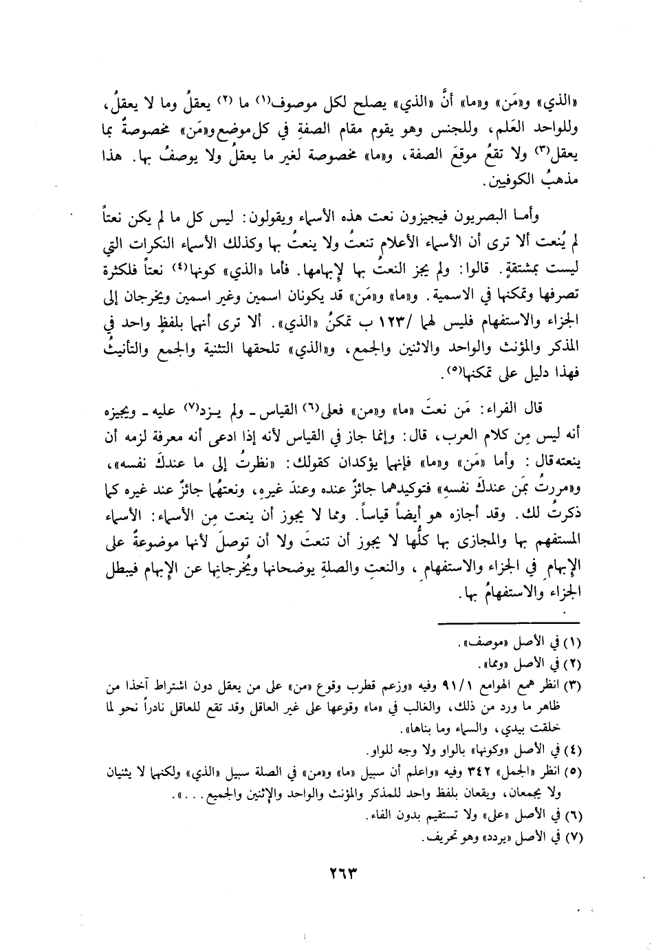 وأما البصريون فيجيزون نعت هذه الأسماء ويقولون: ليس كل ما لم يكن نعتًا لم ينعت ألا ترى أن الأسماء الأعلام تنعت ولا ينعت بها وكذلك الأسماء النكرات التي ليست بمشتقة. قالوا: ولم يجز النعت بها لإبهامها. فأما «الذي» كونها نعتًا فلكثرة تصرفها وتمكنها في الاسمية. و «ما» و «من» قد يكونان اسمين وغير اسمين ويخرجان إلى الجزاء والاستفهام فليس لهما تمكن «الذي». ألا ترى أنهما بلفظ واحد في المذكر والمؤنث والواحد والاثنين والجمع، و «الذي» تحلقها التثنية والجمع والتأنيث فهذا دليل على تمكنها.
