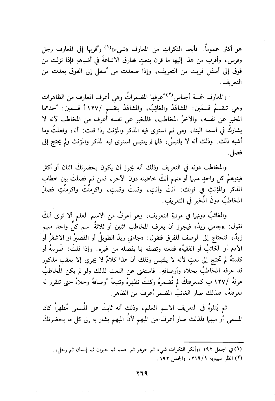 هو أكثر عمومًا. فأبعد النكرات من المعارف «شيء» وأقربها إلى المعارف رجل وفرس، وأقرب من هذا إليها ما قرن بنعت ففارق الإشاعة في أشباهه فإذا نزلت من فوق إلى أسفل قربت من التعريف، وإذا صعدت من أسفل إلى الفوق بعدت من التعريف.