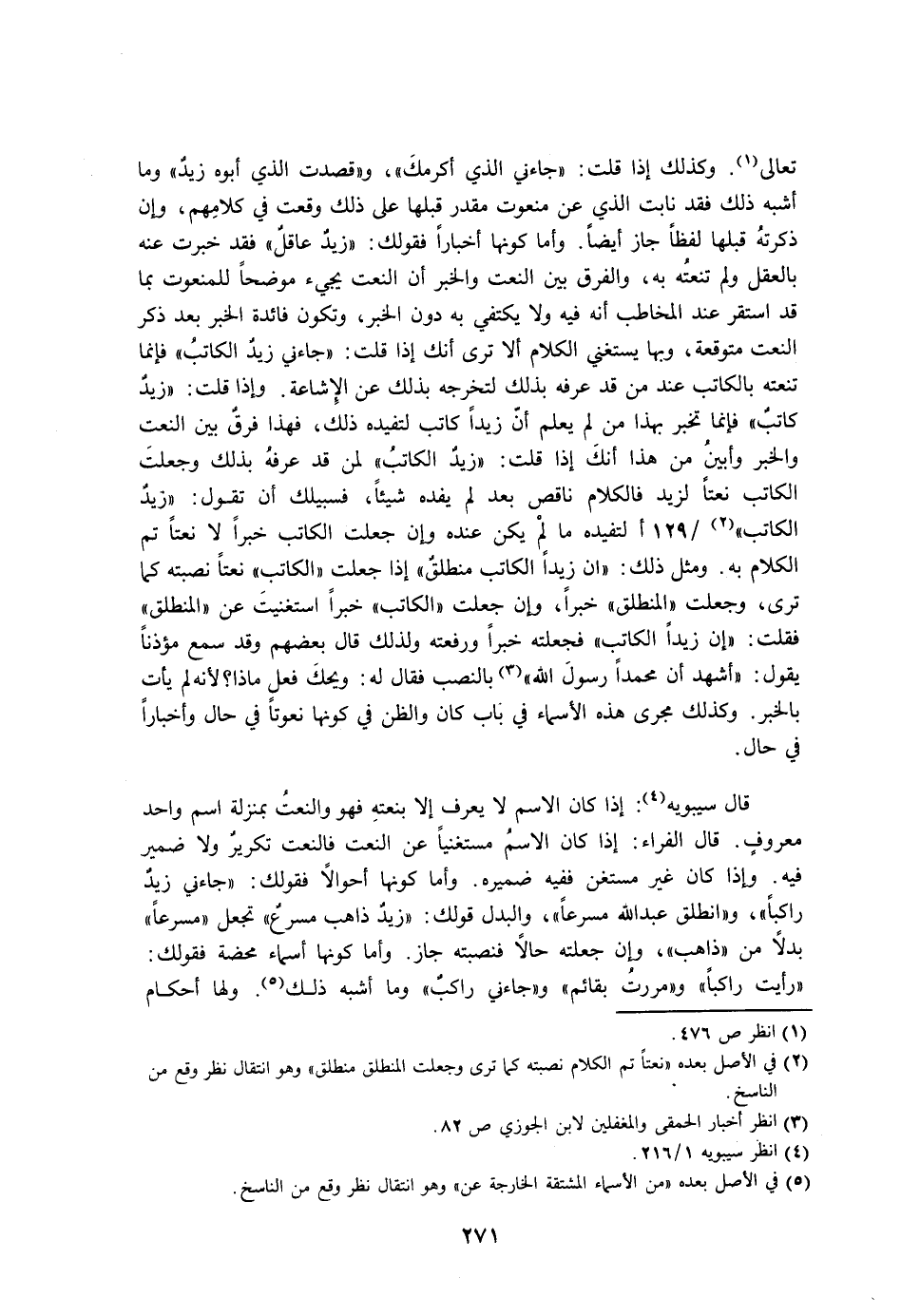 تعالى. وكذلك إذا قلت: «جاءني الذي أكرمك»، و «قصدت الذي أبوه زيد» وما أشبه ذلك فقد نابت الذي عن منعوت مقدر قبلها على ذلك وقعت في كلامهم، وإن ذكرته قبلها لفظًا جاز أيضًا. وأما كونها أخبارًا فقولك: «زيد عاقل» فقد خبرت عنه بالعقل ولم تنعته به، والفرق بين النعت والخبر أن النعت يجيء موضحًا للمنعوت بما قد استقر عند المخاطب أنه فيه ولا يكتفي به دون الخبر، وتكون فائدة الخبر بعد ذكر النعت متوقعة، وبها يستغني الكلام ألا ترى أنك إذا قلت: «جاءني زيد الكاتب» فإنما تنعته بالكاتب عند من قد عرفه بذلك لتخرجه بذلك عن الإشاعة. وإذا قلت: «زيد كاتب» فإنما تخبر بهذا من لم يعلم أن زيدًا كاتب لتفيده ذلك، فهذا فرق بين النعت والخبر وأبين من هذا أنك إذا قلت: «زيد الكاتب» لمن قد عرفه بذلك وجعلت الكاتب نعتًا لزيد فالكلام ناقص بعد لم يفده شيئًا، فسبيلك أن تقول: «زيد الكاتب» لتفيده ما لم يكن عنده وإن جعلت الكاتب خبرًا لا نعتًا تم الكلام به. ومثل ذلك: «أن زيدًا الكاتب منطلق» إذا جعلت «الكاتب» نعتًا نصبته كما ترى، وجعلت «المنطلق» خبرًا، وإن جعلت «الكاتب» خبرًا استغنيت عن «المنطلق» فقلت: «إن زيدًا الكاتب» فجعلته خبرًا ورفعته ولذلك قال بعضهم وقد سمع مؤذنًا يقول: «أشهد أن محمدًا رسول الله» بالنصب فقال له: ويحك فعل ماذا؟ لأنه لم يأت بالخبر. وكذلك مجرى هذه الأسماء في باب كان والظن في كونها نعوتًا في حال وأخبارًا في حال.