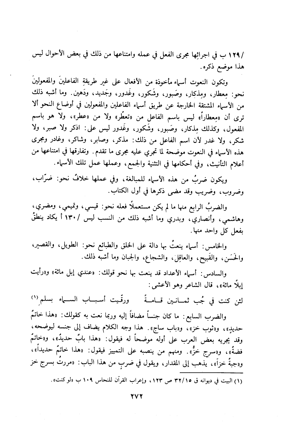 وتكون النعوت أسماء مأخوذة من الأفعال على غير طريقة الفاعلين والمفعولين نحو: معطار، ومذكار، وصبور، وشكور، وغدور، وجديد، ودهين. وما أشبه ذلك من الأسماء المشتقة الخارجة عن طريق أسماء الفاعلين والمفعولين في أوضاع النحو ألا ترى أن «معطارًا» ليس باسم الفاعل من «تعطر» ولا من «عطر»، ولا هو باسم المفعول، وكذلك مذكار، وصبور، وشكور، وغدور ليس على: اذكر ولا صبر، ولا شكر، ولا غدر لأن اسم الفاعل من ذلك: مذكر، وصابر، وشاكر، وغادر ومجرى هذه الأسماء في النعوت موضحة لما تجري عليه مجرى ما تقدم. وتفارقها في امتناعها من أعلام التأنيث، وفي أحكامها في التثنية والجمع، وعملها عمل تلك الأسماء.