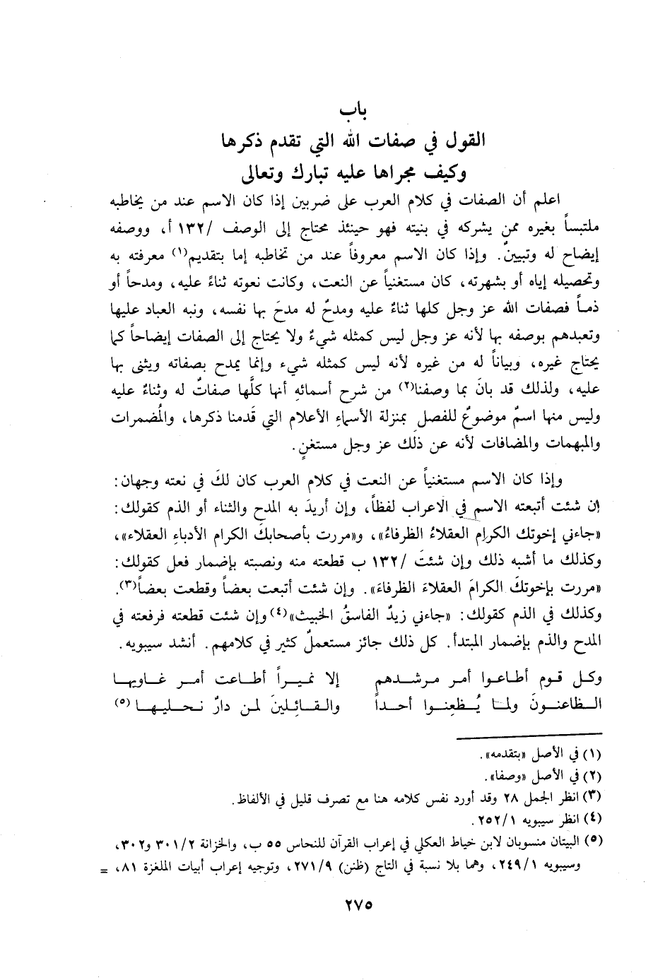 اعلم أن الصفات في كلام العرب على ضربين إذا كان الاسم عند من يخاطبه ملتبسًا بغيره ممن يشركه في بنيته فهو حينئذ محتاج إلى الوصف، ووصفه إيضاح له وتبيين. وإذا كان الاسم معروفًا عند من تخاطبه إما بتقديم معرفته به وتحصيله إياه أو بشهرته، كان مستغنيًا عن النعت، وكانت نعوته ثناءً عليه، ومدحًا أو ذمًا فصفات الله عز وجل كلها ثناء عليه ومدح له مدح بها نفسه، ونبه العباد عليها وتعبدهم بوصفه بها لأنه عز وجل ليس كمثله شيء ولا يحتاج إلى الصفات إيضاحًا كما يحتاج غيره، وبيانًا له من غيره لأنه ليس كمثله شيء وإنما يمدح بصفاته ويثني بها عليه، ولذلك قد بان بما وصفنا من شرح أسمائه أنها كلها صفات له وثناء عليه وليس منها اسم موضوع للفصل بمنزلة الأسماء الأعلام التي قدمنا ذكرها، والمضمرات والمبهمات والمضافات لأنه عن ذلك عز وجل مستغن.