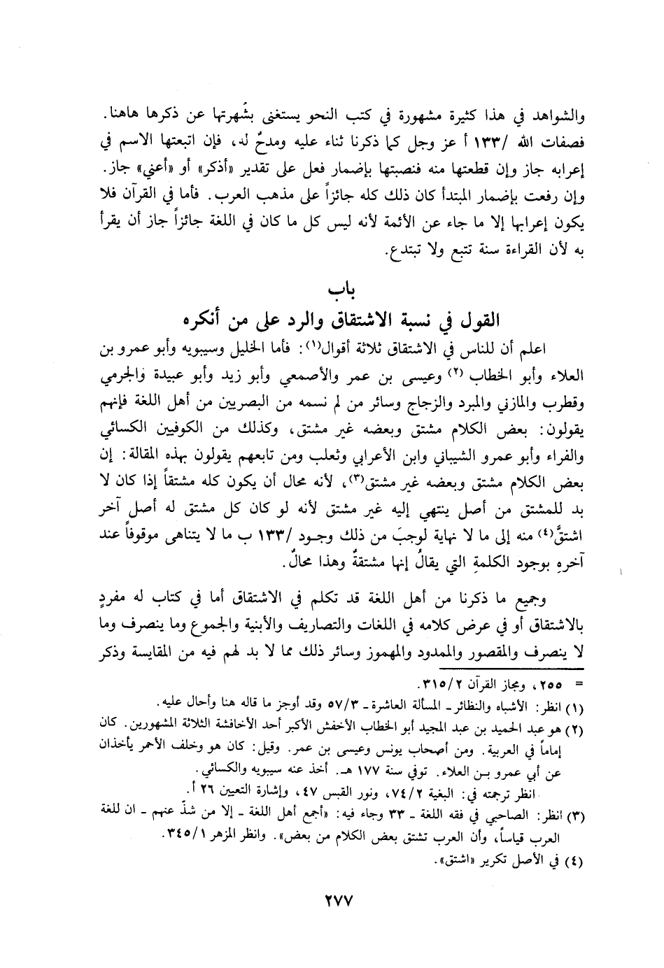 اعلم أن للناس في الاشتقاق ثلاثة أقوال: فأما الخليل وسيبويه وأبو عمرو بن العلاء وأبو الخطاب وعيسى بن عمر والأصمعي وأبو زيد وأبو عبيدة والجرمي وقطرب والمازني والمبرد والزجاج وسائر من لم نسمه من البصريين من أهل اللغة فإنهم يقولون: بعض الكلام مشتق وبعضه غير مشتق، وبعضه غير مشتق، لأنه محال أن يكون كله مشتقًا إذا كان لا بد للمشتق من أصل ينتهي إليه غير مشتق لأنه لو كان كل مشتق له أصل آخر اشتق منه إلى ما لا نهاية لوجب من ذلك وجود ما لا يتناهى موقوفًا عند آخره بوجود الكلمة التي يقال إنها مشتقة وهذا محال.