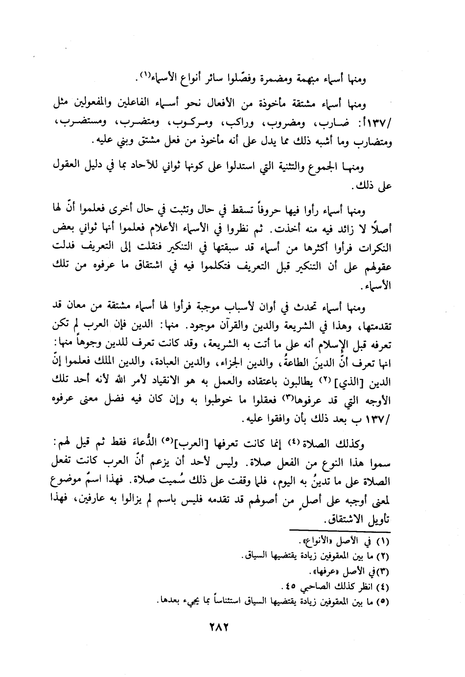 وكذلك الصلاة إنما كانت تعرفها [العرب] الدعاء فقط ثم قيل لهم: سموا هذا النوع من الفعل صلاة. وليس لأحد أن يزعم أن العرب كانت تفعل الصلاة على ما تدين به اليوم، فلما وقفت على ذلك سميت صلاة. فهذا اسم موضوع لمعنى أوجبه على أصل من أصولهم قد تقدمه فليس باسم لم يزالوا به عارفين، فهذا تأويل الاشتقاق.