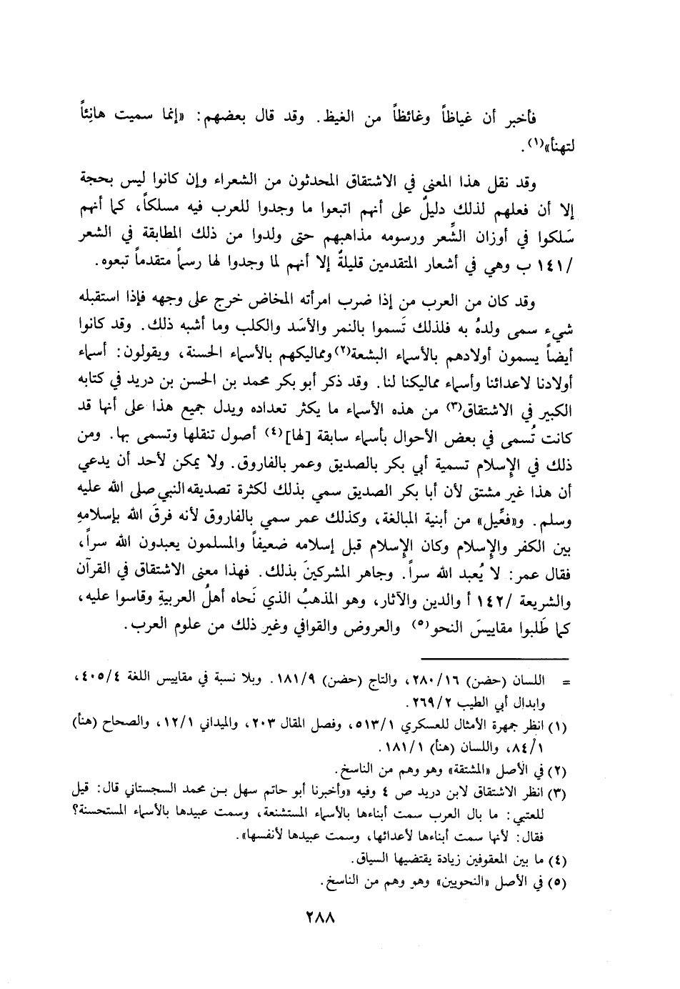 وقد كان من العرب من إذا ضرب امرأته المخاض خرج على وجهه فإذا استقبله شيء سمى ولده به فلذلك تسموا بالنمر والأسد والكلب وما أشبه ذلك. وقد كانوا أيضًا يسمون أولادهم بالأسماء البشعة ومماليكهم بالأسماء الحسنة، ويقولون: أسماء أولادنا لأعدائنا وأسماء مماليكنا لنا. وقد ذكر أبو بكر محمد بن الحسن بن دريد في كتابه الكبير في الاشتقاق من هذه الأسماء ما يكثر تعداده ويدل جميع هذا على أنها قد كانت تسمى في بعض الأحوال بأسماء سابقة [لها] أصول تنقلها وتسمى بها. ومن ذلك في الإسلام تسمية أبي بكر بالصديق وعمر بالفاروق. ولا يمكن لأحد أن يدعي أن هذا غير مشتق لأن أبا الصديق سمي بذلك لكثرة تصديقه النبي صلى الله عليه وسلم. و «فعيل» من أبنية المبالغة، وكذلك عمر سمي بالفاروق لأنه فرق الله بإسلامه بين الكفر والإسلام وكان الإسلام قبل إسلامه ضعيفًا والمسلمون يعبدون الله سرًا، فقال عمر: لا يعبد الله سرًا. وجاهر المشركين بذلك. فهذا معنى الاشتقاق في القرآن والشريعة والدين والآثار، وهو المذهب الذي نحاه أهل العربية وقاسوا عليه، كما طلبوا مقاييس النحو والعروض والقوافي وغير ذلك من علوم العرب.