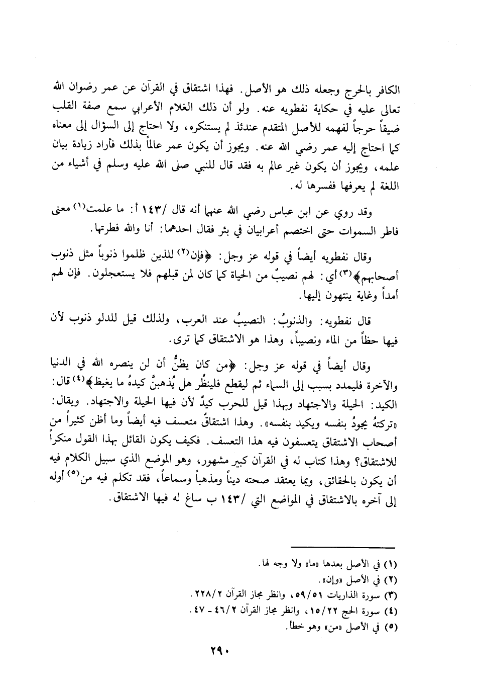 الكافر بالحرج وجعله ذلك هو الأصل. فهذا اشتقاق في القرآن عن عمر رضوان الله تعالى عليه في حكاية نفطويه عنه. ولو أن ذلك الغلام الأعرابي سمع صفة القلب ضيقًا حرجًا لفهمه للأصل المتقدم عندئذ لم يستنكره، ولا احتاج إلى السؤال إلى معناه كما احتاج إليه عمر رضي الله عنه. ويجوز أن يكون عمر عالمًا بذلك فأراد زيادة بيان علمه، ويجوز أن يكون غير عالم به فقد قال للنبي صلى الله عليه وسلم في أشياء من اللغة لم يعرفها ففسرها له.