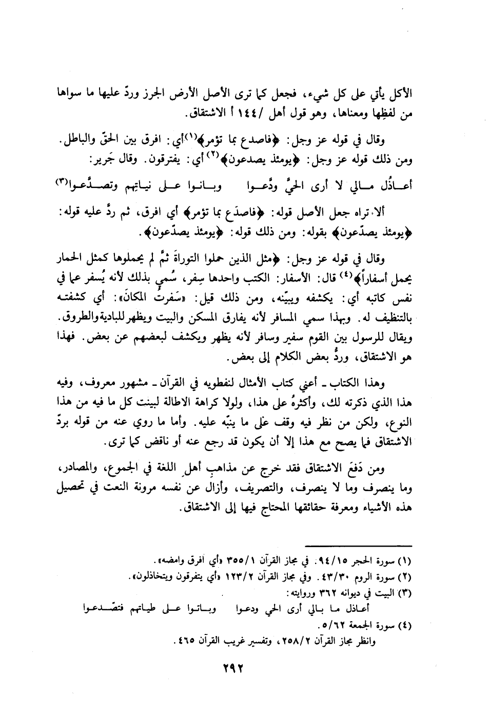 وهذا الكتاب - أعني كتاب الأمثال لنفطويه في القرآن - مشهور معروف، وفيه هذا الذي ذكرته لك، وأكثره على هذا، ولولا كراهة الإطالة لبينت كل ما فيه من هذا النوع، ولكن من نظر فيه وقف على ما ينبه عليه. وأما ما روي عنه من قوله برد الاشتقاق فيما يصح مع هذا إلا أن يكون قد رجع عنه أو ناقض كما ترى.