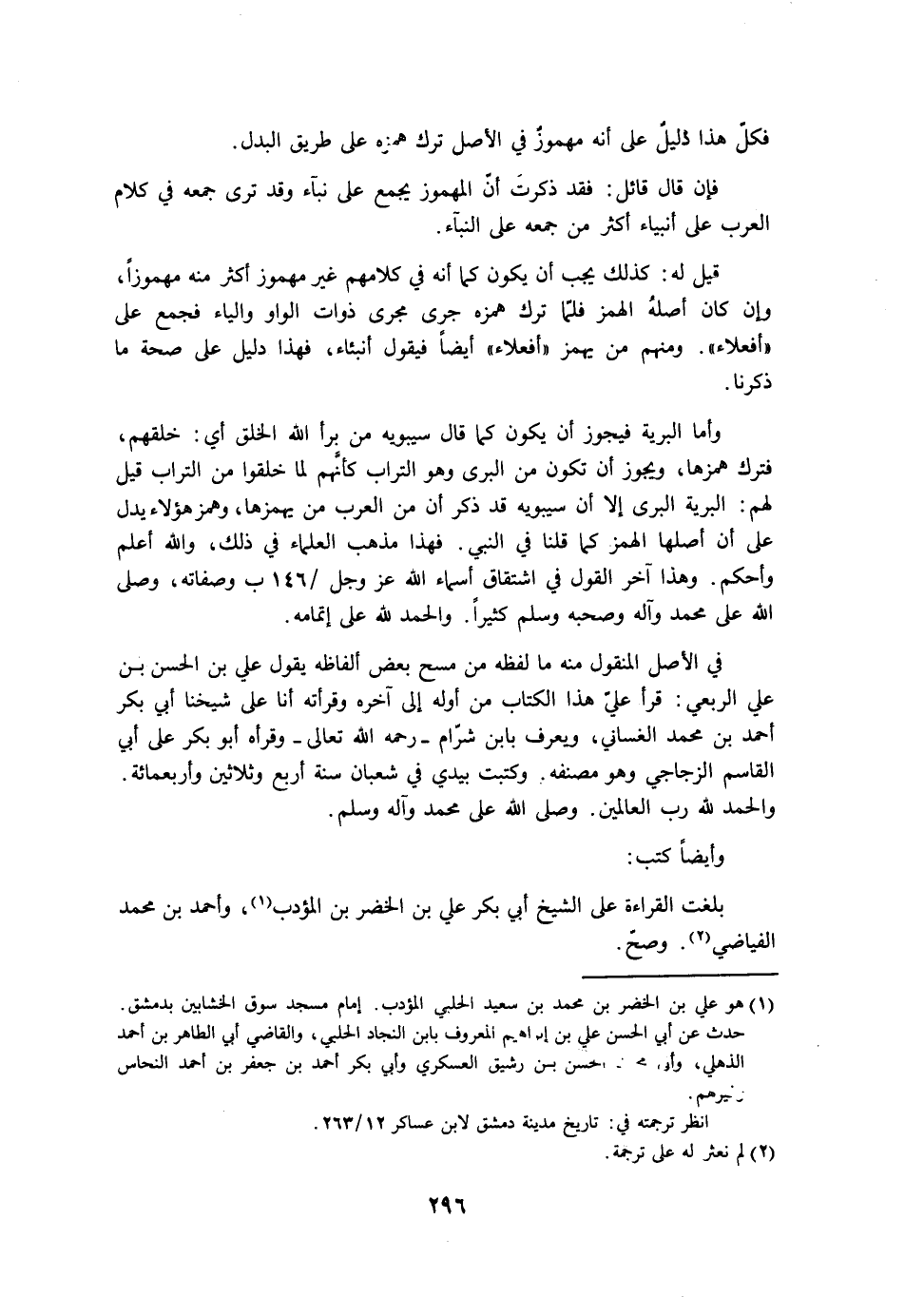 في الأصل المنقول منه ما لفظه من مسح بعض ألفاظه يقول علي بن الحسن بن علي الربعي: قرأ علي هذا الكتاب من أوله إلى آخره وقرأته أنا على شيخنا أبي بكر أحمد ابن محمد الغساني، ويعرف بابن شرام -رحمه الله تعالى- وقرأه أبو بكر على أبي القاسم الزجاجي وهو مصنفه. وكتبت بيدي في شعبان سنة أربع وثلاثين وأربعمائة. والحمد لله رب العالمين. وصلى الله على محمد وآله وسلم.