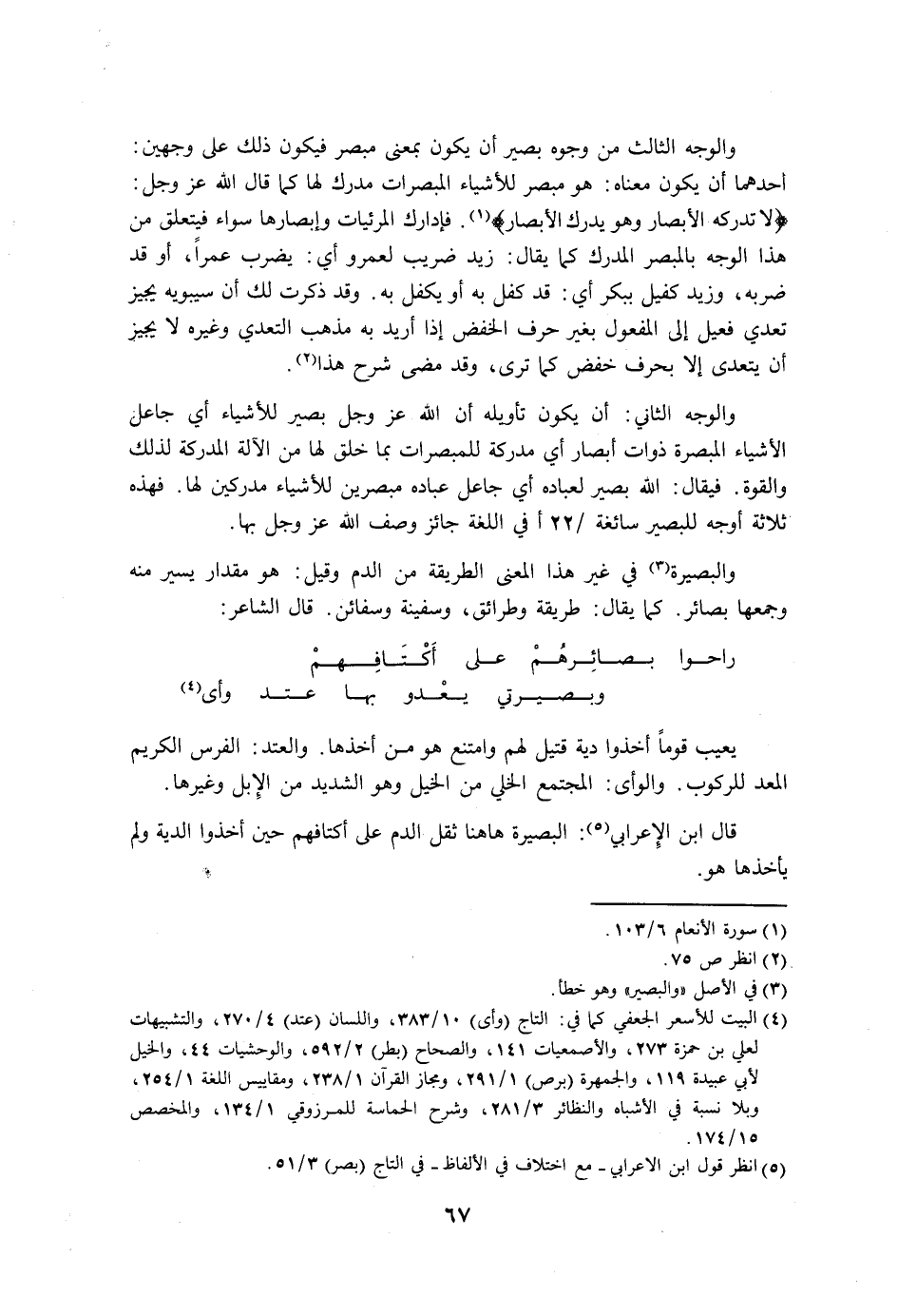 والوجه الثاني: أن يكون تأويله أن الله عز وجل بصير للأشياء أي جاعل الأشياء المبصرة ذوات أبصار أي مدركة للمبصرات بما خلق لها من الآلة المدركة لذلك والقوة. فيقال: الله بصير لعباده أي جاعل عباده مبصرين للأشياء مدركين لها. فهذه ثلاثة أوجه للبصير سائغة في اللغة جائز وصف الله عز وجل بها.