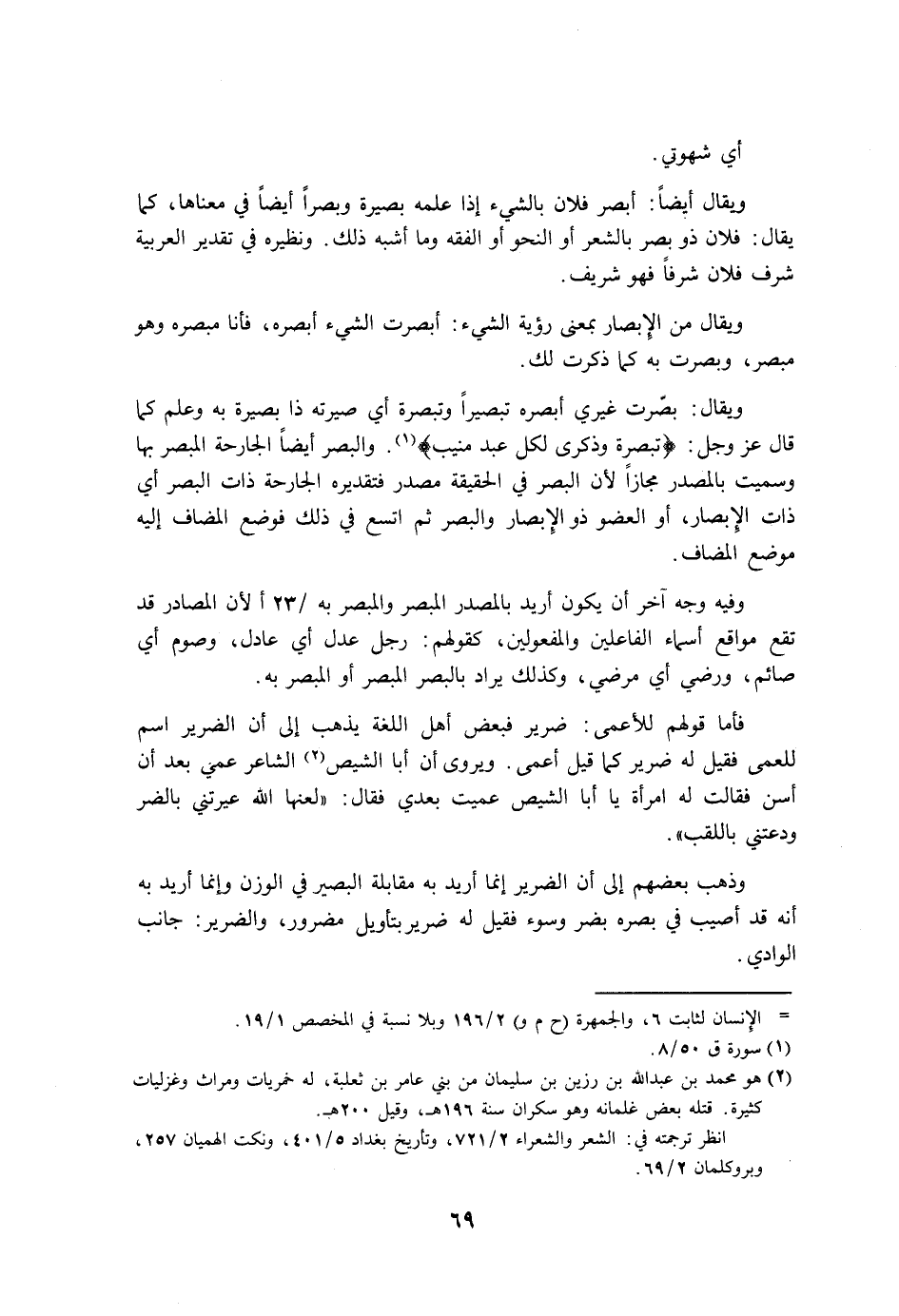 فأما قولهم للأعمى: ضرير فبعض أهل اللغة يذهب إلى أن الضرير اسم للعمى فقيل له ضرير كما قيل أعمى. ويروى أن أبا الشيص الشاعر عمي بعد أن أسن فقالت له امرأة يا أبا الشيص عميت بعدي فقال: «لعنها الله عيرتني بالضر ودعتني باللقب».