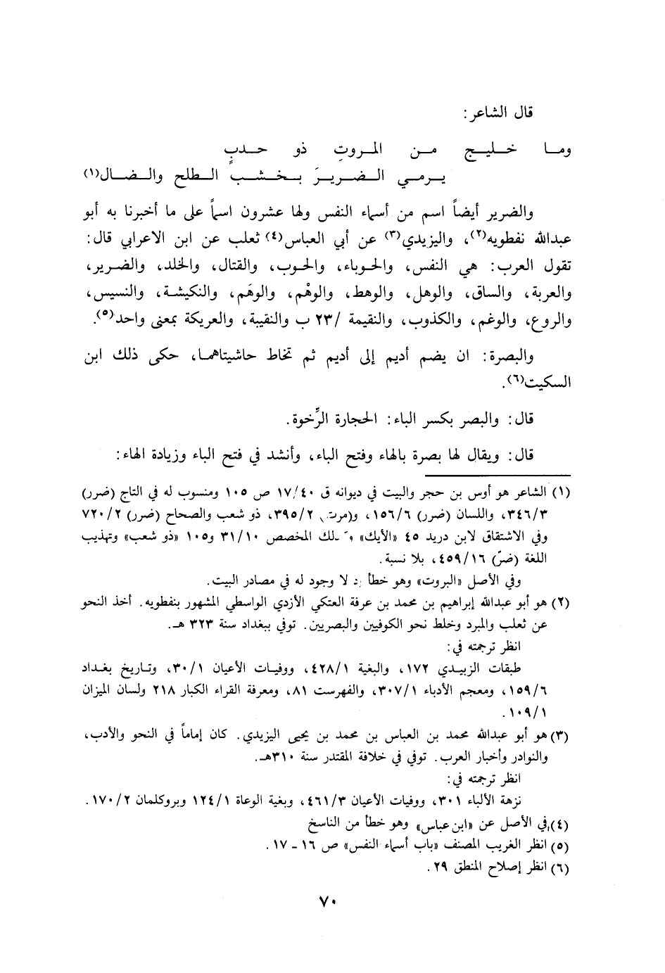 والضرير أيضًا اسم من أسماء النفس ولها عشرون اسمًا على ما أخبرنا به أو عبد الله نفطويه، واليزيد عن أبي العباس ثعلب عن ابن الأعرابي قال: تقول العرب: هي النفس، والحوباء، والحوب، والقتال، والخلد، والضرير، والعربة، والساق، والوهل، والوهط، والوهم، والوهم، والنكيشة، والنسيس، والروع، والوغم، والكذوب، والنقيمة والنقيبة، والعريكة بمعنى واحد.