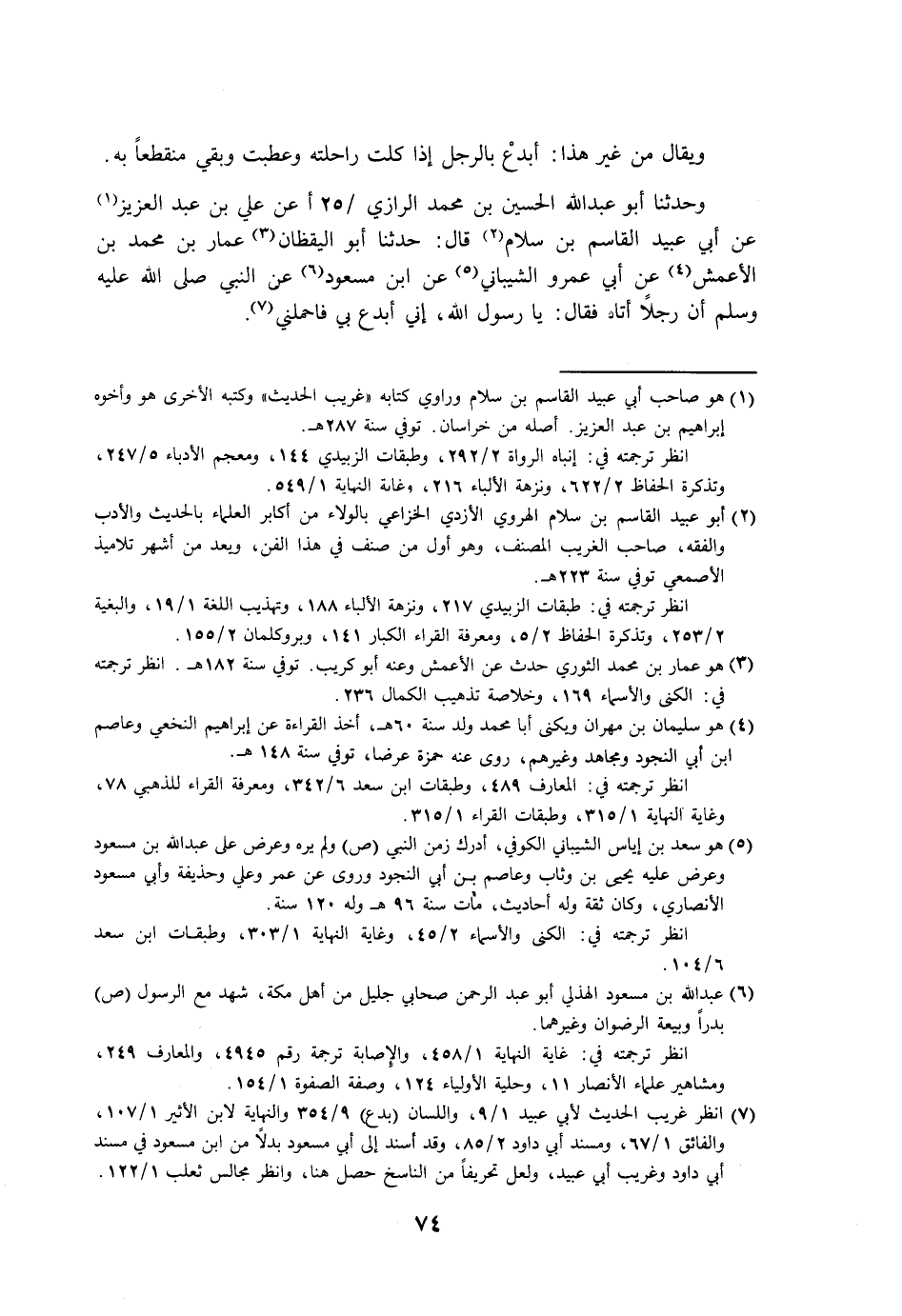 وحدثنا أبو عبد الله الحسين بن محمد الرازي عن علي بن عبد العزيز عن أبي عبيد القاسم بن سلام قال: حدثنا أبو اليقظان عمار بن محمد بن الأعمش عن أبي عمرو الشيباني عن ابن مسعود عن النبي صلى الله عليه وسلم أن رجلاً أتاه فقال: يا رسول الله، إني أبدع بي فاحملني.