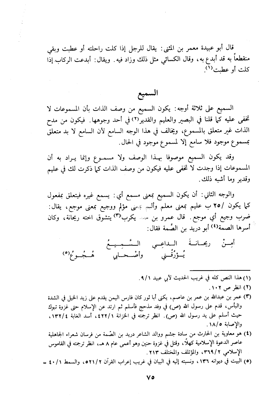 السميع على ثلاثة أوجه: يكون السميع من وصف الذات بأن المسموعات لا تخفي عليه كما قلنا في البصير والعليم والقدير في أحد وجوهها. فيكون من مدح الذات غير متعلق بالمسموع، ويخالف في هذا الوجه السامع لأن السامع لا بد متعلق بمسموع موجود فلا سامع إلا لمسموع موجود في الحال.