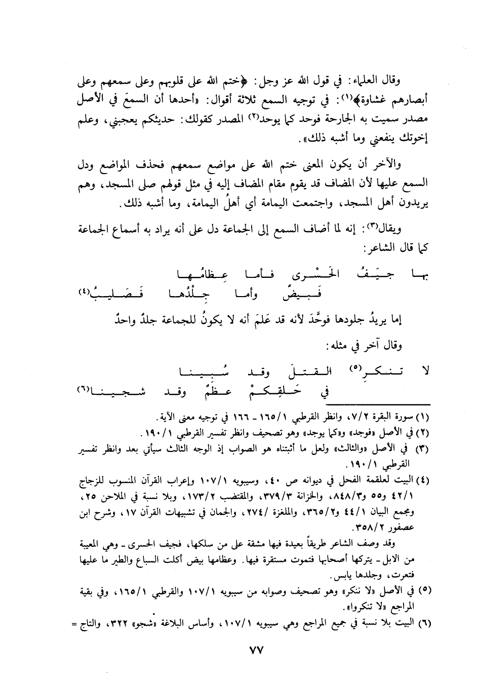 وقال العلماء: في قول الله عز وجل: {ختم الله على قلوبهم وعلى سمعهم وعلى أبصارهم غشاوة}: في توجيه السمع ثلاثة أقوال: «أحدها أن السمع في الأصل مصدر سميت به الجارحة فوحد كما يوحد المصدر كقولك: حديثكم يعجبني، وعلم إخوتك ينفعني وما أشبه ذلك».