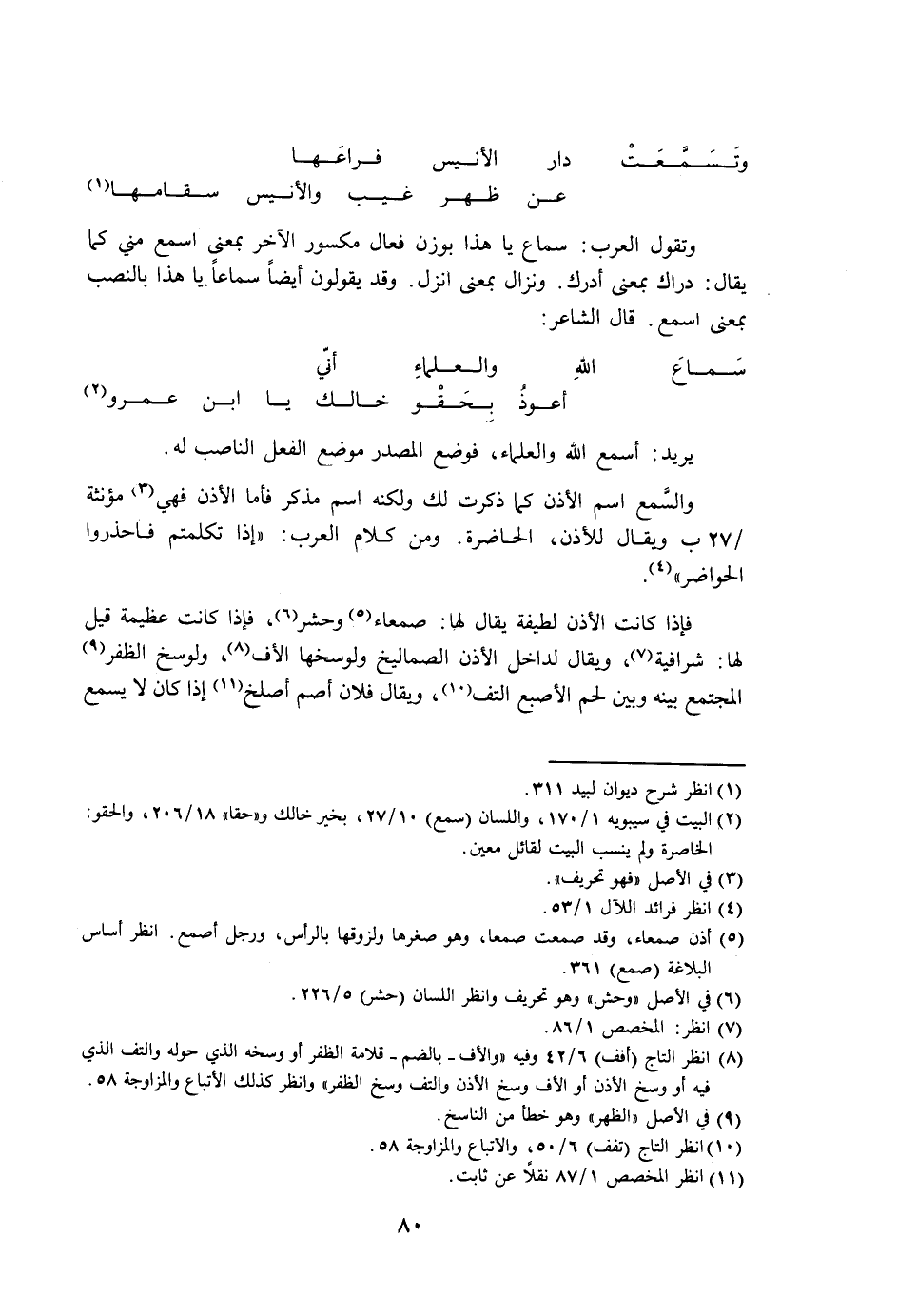 والسمع اسم الأذن كما ذكرت لك ولكنه اسم مذكر فأما الأذن فهي مؤنثة ويقال للأذن، الحاضرة. ومن كلام العرب: «إذا تكلمتم فاحذروا الحواضر».