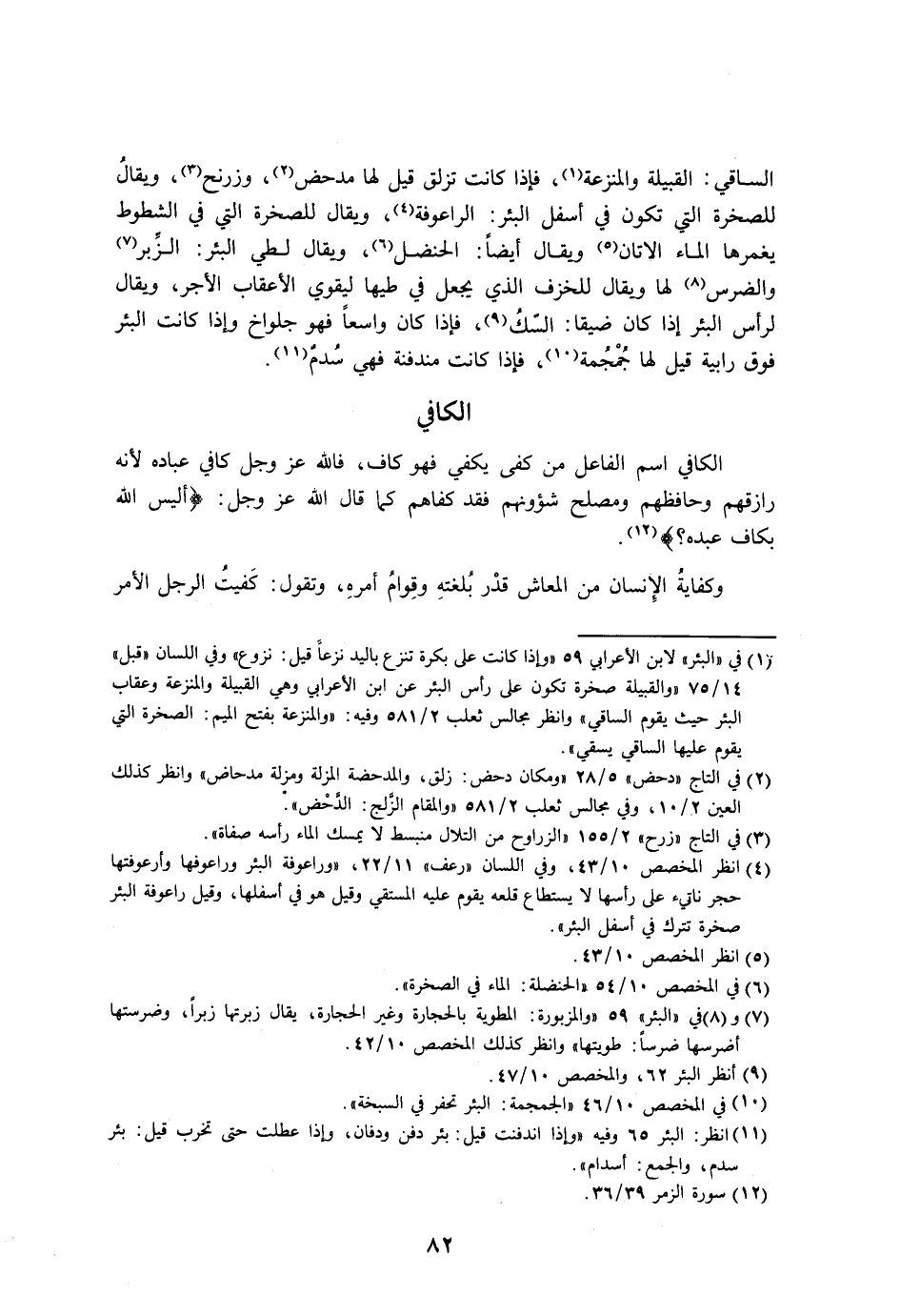 الساقي: القبيلة والمنزعة، فإذا كانت تزلق قيل لها مدحض، وزرنح، ويقال للصخرة التي تكون في أسفل البئر: الراعوفة، ويقال للصخرة التي في الشطوط يغمرها الماء الاتان ويقال أيضًا: الحنضل، ويقال لطي البئر: الزبر والضرس لها ويقال للخزف الذي يجعل في طيها ليقوي الأعقاب الأجر، ويقال لرأس البئر إذا كان ضيقًا: السك، فإذا كان واسعًا فهو جلواخ وإذا كانت البئر فوق رابية قيل لها جمجمة، فإذا كانت مندفنة فهي سدم.