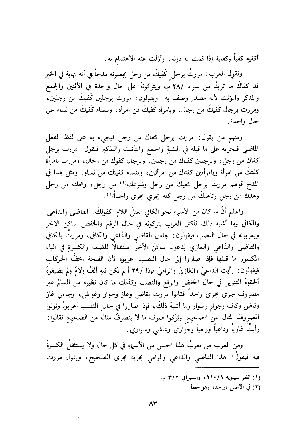 واعلم أن ما كان من الأسماء نحو الكافي معتل اللام كقولك: القاضي والداعي والكافي وما أشبه ذلك فأكثر العرب يتركونه في حال الرفع والخفض ساكن الآخر ويعربونه في حال النصب فيقولون: جاءني القاضي والداعي والكافي، ومررت بالكافي والقاضي والداعي والغازي يدعونه ساكن الآخر استثقالاً للضمة والكسرة في الياء المكسور ما قبلها فإذا صاروا إلى حال النصب أعربوه لأن الفتحة اخف الحركات فيقولون: رأيت الداعي والغازي والرامي فإذا لم يكن فيه ألف ولام ولم يضيفوه ألحقوه التنوين في حال الخفض والرفع والنصب وكذلك ما كان نظيره من السالم غير مصروف جرى مجرى واحدًا فقالوا مررت بقاض وغاز وجوار وغواش، وجاءني غاز وقاض وكاف وجوار وسوار وما أشبه ذلك، فإذا صاروا في حال النصب أعربوه ونونوا المصروف المثال من الصحيح وتركوا صرف ما لا ينصرف مثاله من الصحيح فقالوا: رأيت غازيًا وداعيًا وراميًا وجواري وغاشي وسواري.