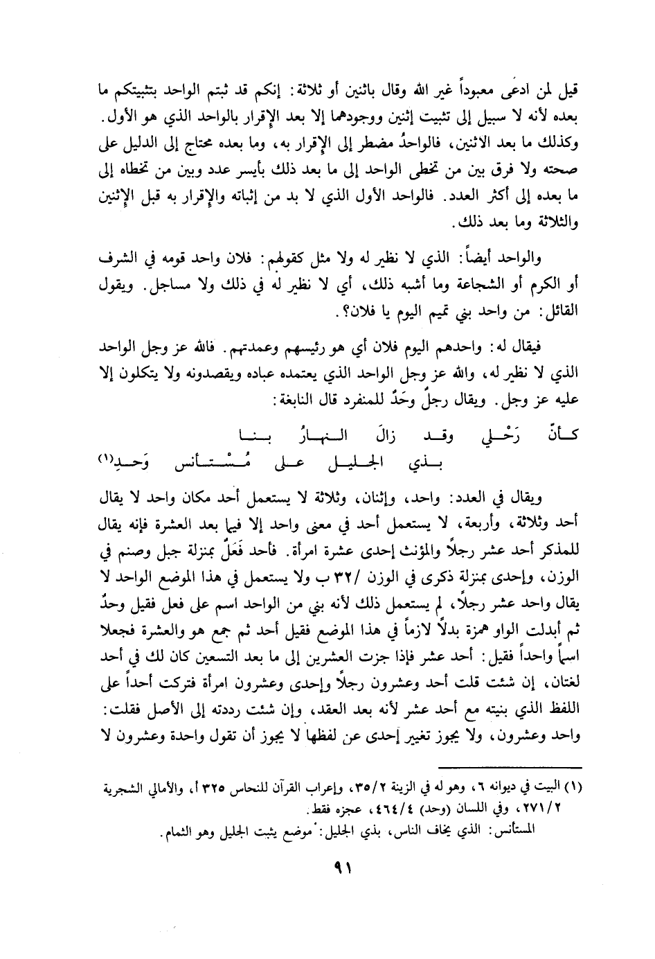 ويقال في العدد: واحد، واثنان، وثلاثة لا يستعمل أحد مكان واحد لا يقال أحد وثلاثة، وأربعة، لا يستعمل أحد في معنى واحد إلا فيما بعد العشرة فإنه يقال للمذكر أحد عشر رجلاً والمؤنث إحدى عشرة امرأة. فأحد فعل بمنزلة جبل وصنم في الوزن، وإحدى بمنزلة ذكرى في الوزن ولا يستعمل في هذا الموضع الواحد لا يقال واحد عشر رجلاً، لم يستعمل ذلك لأنه بني من الواحد اسم على فعل فقيل وحد ثم أبدلت الواو همزة بدلاً لازمًا في هذا الموضع فقيل أحد ثم جمع هو والعشرة فجعلا اسمًا واحدًا فقيل: أحد عشر فإذا جزت العشرين إلى ما بعد التسعين كان لك في أحد لغتان، إن شئت قلت أحد وعشرون رجلاً وإحدى وعشرون امرأة فتركت أحدًا على اللفظ الذي بنيته مع أحد عشر لأنه بعد العقد، وإن شئت رددته إلى الأصل فقلت: واحد وعشرون، ولا يجوز تغيير إحدى عن لفظها لا يجوز أن تقول واحدة وعشرون لا