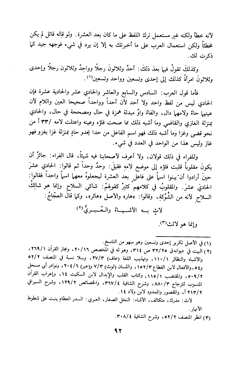 فأما قول العرب: السادس والسابع والعاشر والحادي عشر والحادية عشرة فإن الحادي ليس من لفظ واحد ولا أحد لأن أحدًا وواحدًا صحيحًا العين واللام لأن عينهما حاء ولامهما دال، والفاء واو مبدلة همزة في حال ومصححة في حال، والحادي بمنزلة الغازي والقاضي وما أشبه ذلك مما صحت فاؤه وعينه واعتلت لامه من نحو قضى وغزا وما أشبه ذلك فهو اسم الفاعل من حدا يحدو حادٍ بمنزلة غزا يغزو فهو غاز وليس هذا من الواحد في العدد في شيء.