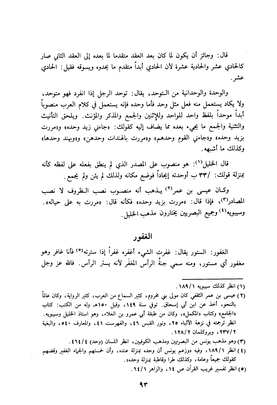 وكان عيسى بن عمر يذهب أنه منصوب نصب الظروف لا نصب المصادر، فإذا قال: «مررت بزيد وحده» فكأنه قال: «مررت به على حياله». وسيبويه وجميع البصريين يختارون مذهب الخليل.
