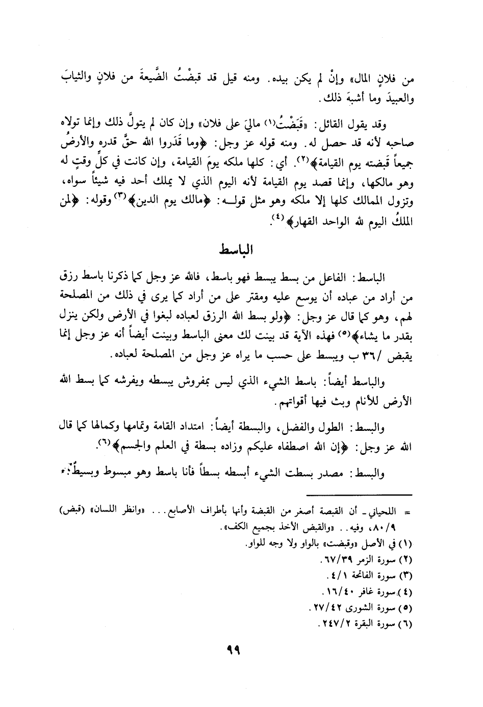 وقد يقول القائل: «قبضت مالي على فلان» وإ، كان لم يتول ذلك وإنما تولاه صاحبه لأنه قد حصل له. ومنه قوله عز وجل: {وما قدروا الله حق قدره والأرض جميعًا قبضته يوم القيامة}. أي: كلها ملكه يوم القيامة، وإن كنت في كل وقت له وهو مالكها، وإنما قصد يوم القيامة لأنه اليوم الذي لا يملك أحد فيه شيئًا سواه، وتزول الممالك كلها إلا ملكه وهو مثل قوله: {مالك يوم الدين} وقوله: {لمن الملك اليوم لله الواحد القهار}.
