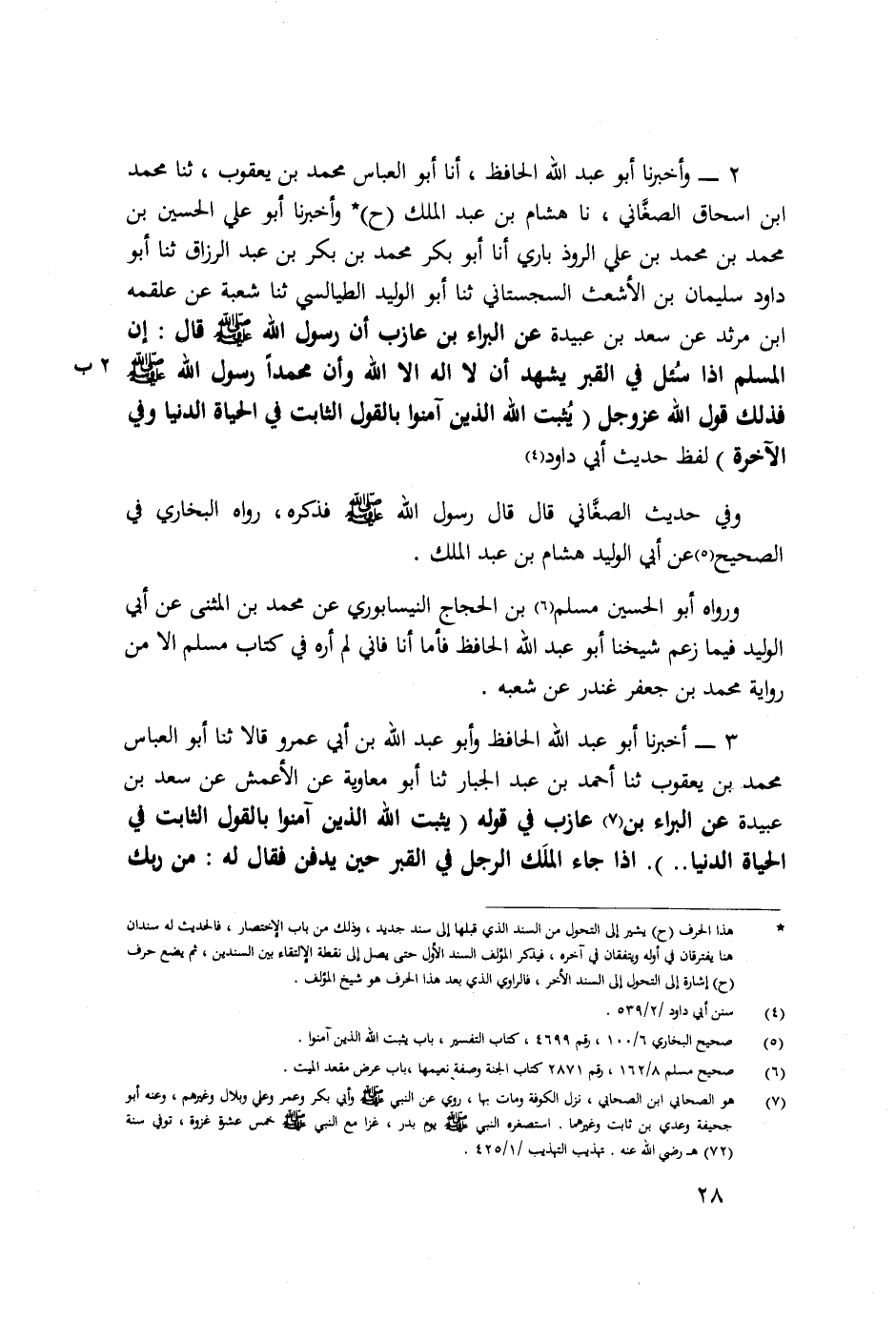 ٢ - وَأَخْبَرَنَا أَبُو عَبْدِ اللَّهِ الْحَافِظُ، أَنَا أَبُو الْعَبَّاسِ مُحَمَّدُ بْنُ يَعْقُوبَ، ثَنَا مُحَمَّدُ بْنُ إِسْحَاقَ الصَّغَانِيُّ، نَا هِشَامُ بْنُ عَبْدِ الْمَلِكِ ح وَأَخْبَرَنَا أَبُو عَلِيٍّ الْحُسَيْنُ بْنُ مُحَمَّدِ بْنِ مُحَمَّدِ بْنِ عَلِيٍّ الرُّوذْبَارِيُّ، أَنَا أَبُو بَكْرٍ مُحَمَّدُ بْنُ بَكْرِ بْنِ عَبْدِ الرَّزَّاقِ، ثَنَا أَبُو دَاوُدَ سُلَيْمَانُ بْنُ الْأَشْعَثَ السِّجِسْتَانِيُّ، ثَنَا أَبُو الْوَلِيدِ الطَّيَالِسِيُّ، ثَنَا شُعْبَةُ عْنُ عَلْقَمَةَ بْنِ مَرْثَدٍ، عَنْ سَعْدِ بْنِ عُبَيْدَةَ، عَنِ الْبَرَاءِ بْنِ عَازِبٍ أَنَّ رَسُولَ اللَّهِ صَلَّى اللهُ عَلَيْهِ وَسَلَّمَ قَالَ: " إِنَّ الْمُسْلِمَ إِذَا سُئِلَ فِي الْقَبْرِ يَشْهَدُ أَنْ لَا إِلَهَ إِلَّا اللَّهُ وَأَنَّ مُحَمَّدًا رَسُولُ اللَّهِ صَلَّى اللهُ عَلَيْهِ وَسَلَّمَ، فَذَلِكَ قَوْلُ اللَّهِ عَزَّ وَجَلَّ {يُثَبِّتُ اللَّهُ الَّذِينَ آمَنُوا بِالْقَوْلِ الثَّابِتِ فِي الْحَيَاةِ الدُّنْيَا وَفِي الْآخِرَةِ} [إبراهيم: ٢٧] " لَفْظُ حَدِيثِ أَبِي دَاوُدَ، وَفِي حَدِيثِ الصَّغَانِيِّ قَالَ: قَالَ رَسُولُ اللَّهِ صَلَّى اللَّهُ عَلَيْهِ وَسَلَّم، فَذَكَرَهُ، رَوَاهُ الْبُخَارِيُّ فِي الصَّحِيحِ عَنْ أَبِي الْوَلِيدِ هِشَامِ بْنِ عَبْدِ الْمَلِكِ، وَرَوَاهُ أَبُو الْحُسَيْنُ مُسْلِمُ بْنُ الْحَجَّاجِ النَّيْسَابُورِيُّ، عَنْ مُحَمَّدِ بْنِ الْمُثَنَّى، عَنْ أَبِي الْوَلِيدِ فِيمَا زَعَمَ شَيْخُنَا أَبُو عَبْدِ اللَّهِ الْحَافِظُ، فَأَمَّا أَنَا فَإِنِّي لَمْ أَرَهُ فِي كِتَابِ مُسْلِمٍ إِلَّا مِنْ رِوَايَةِ مُحَمَّدِ بْنِ جَعْفَرٍ غُنْدَرٍ عَنْ شُعْبَةَ