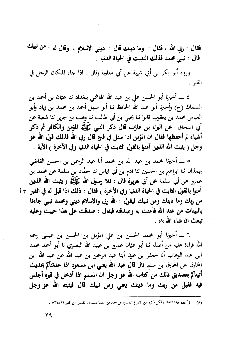 ٦ - أَخْبَرَنَا أَبُو مُحَمَّدٍ الْحَسَنُ بْنُ عَلِيٍّ الْمُؤَمَّلُ بْنُ الْحَسَنِ بْنِ عِيسَى رَحِمَهُ اللَّهُ، قِرَاءَةً عَلَيْهِ مِنْ أَصْلِهِ، ثَنَا أَبُو عُثْمَانَ عَمْرُو بْنُ عَبْدِ اللَّهِ الْبَصْرِيُّ، نَا أَبُو أَحْمَدَ مُحَمَّدُ بْنُ عَبْدِ الْوَهَّابِ، أَنَا جَعْفَرُ بْنُ عَوْنٍ، أنا عَبْدِ الرَّحْمَنِ بْنِ عَبْدِ اللَّهِ، عَنْ عَبْدِ اللَّهِ بْنِ الْمُخَارِقِ، عَنِ الْمُخَارِقِ بْنِ سُلَيْمٍ قَالَ: قَالَ عَبْدُ اللَّهِ يَعْنِي ابْنَ مَسْعُودٍ: إِذَا حَدَّثْنَاكُمْ بِحَدِيثٍ آتَيْنَاكُمْ بِتَصْدِيقِ ذَلِكَ مِنْ كِتَابِ اللَّهِ عَزَّ وَجَلَّ، إِنَّ الْمُسْلِمَ إِذَا دَخَلَ قَبْرَهُ أُجْلِسَ فِيهِ فَقِيلَ: مَنْ رَبُّكَ؟ وَمَا دِينُكَ؟ يَعْنِي وَمَنْ نَبِيُّكَ؟ قَالَ: فَيُثَبِّتُهُ اللَّهُ عَزَّ وَجَلَّ ⦗٣٠⦘، فَيَقُولُ: رَبِّيَ اللَّهُ وَدِينِيَ الْإِسْلَامُ وَنَبِيِّي مُحَمَّدٌ قَالَ: فَيُوسَعُ لَهُ قَبْرُهُ، وَيَرُوحُ لَهُ فِيهِ، ثُمَّ قَرَأَ {يُثَبِّتُ اللَّهُ الَّذِينَ آمَنُوا بِالْقَوْلِ الثَّابِتِ فِي الْحَيَاةِ الدُّنْيَا} [إبراهيم: ٢٧] الْآيَةُ، وَإِنَّ الْكَافِرَ إِذَا دَخَلَ قَبْرَهُ أُجْلِسَ فِيهِ، فَقِيلَ لَهُ: مَنْ رَبُّكَ؟ وَمَا دِينُكَ؟ وَمَنْ نَبِيُّكَ؟ فَيَقُولُ: لَا أَدْرِي فَيَضِيقُ عَلَيْهِ قَبْرُهُ وَيُعَذَّبُ فِيهِ، ثُمَّ قَرَأَ عَبْدُ اللَّهِ {وَمَنْ أَعْرَضَ عَنْ ذِكْرِي فَإِنَّ لَهُ مَعِيشَةً ضَنْكًا وَنَحْشُرُهُ يَوْمَ الْقِيَامَةِ أَعْمَى "} [طه: ١٢٤]