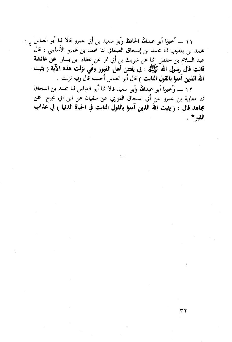 ١٢ - وَأَخْبَرَنَا أَبُو عَبْدِ اللَّهِ، وَأَبُو سَعِيدٍ قَالَا: ثَنَا أَبُو الْعَبَّاسِ، ثَنَا مُحَمَّدُ بْنُ إِسْحَاقَ، ثَنَا مُعَاوِيَةُ بْنُ عَمْرِو، عْنِ أَبِي إِسْحَاقَ الْفَزَارِيُّ، عَنْ سُفْيَانَ، عَنِ ابْنِ أَبِي نَجِيحٍ، عَنْ مُجَاهِدٍ قَالَ: {يُثَبِّتُ اللَّهُ الَّذِينَ آمَنُوا بِالْقَوْلِ الثَّابِتِ فِي الْحَيَاةِ الدُّنْيَا} [إبراهيم: ٢٧] فِي عَذَابِ الْقَبْرِ "