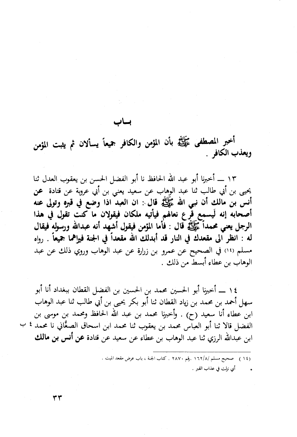 ١٣ - أَخْبَرَنَا أَبُو عَبْدِ اللَّهِ الْحَافِظُ، نَا أَبُو الْفَضْلِ الْحَسَنُ بْنُ يَعْقُوبَ الْعَدْلُ، ثَنَا يَحْيَى بْنُ أَبِي طَالِبٍ، ثَنَا عَبْدُ الْوَهَّابِ، عَنْ سَعِيدٍ يَعْنِي ابْنَ أَبِي عَرُوبَةَ، عَنْ قَتَادَةَ، عَنْ أَنَسِ بْنِ مَالِكٍ أَنُّ نَبِيَّ اللَّه صَلَّى اللهُ عَلَيْهِ وَسَلَّمَِ قَالَ: " إِنَّ الْعَبْدَ إِذَا وُضِعَ فِي قَبْرِهِ وَتَوَلَّى عَنْهُ أَصْحَابُهُ، إِنَّهُ لَيَسْمَعُ قَرْعَ نِعَالِهِمْ، فَيَأْتِيهِ مَلَكَانِ، فَيَقُولَانِ: مَا كُنْتَ تَقُولُ فِي هَذَا الرَّجُلِ؟ يَعْنِي مُحَمَّدًا صَلَّى اللهُ عَلَيْهِ وَسَلَّمَ قَالَ: فَأَمَّا الْمُؤْمِنُ فَيَقُولُ: أَشْهَدُ أَنَّهُ عَبْدُ اللَّهِ وَرَسُولُهُ، فَيُقَالُ لَهُ: انْظُرْ إِلَى مَقْعَدِكَ فِي النَّارِ، قَدْ أَبْدَلَكَ اللَّهُ مَقْعَدًا فِي الْجَنَّةِ، فَيَرَاهُمَا جَمِيعًا " رَوَاهُ مُسْلِمٌ فِي الصَّحِيحِ عَنْ عَمْرِو بْنِ زُرَارَةَ، عَنْ عَبْدِ الْوَهَّابِ، وَرُوِي ذَلِكَ عَنْ عَبْدِ الْوَهَّابِ بْنِ عَطَاءٍ أَبْسَطَ مِنْ ذَلِكَ