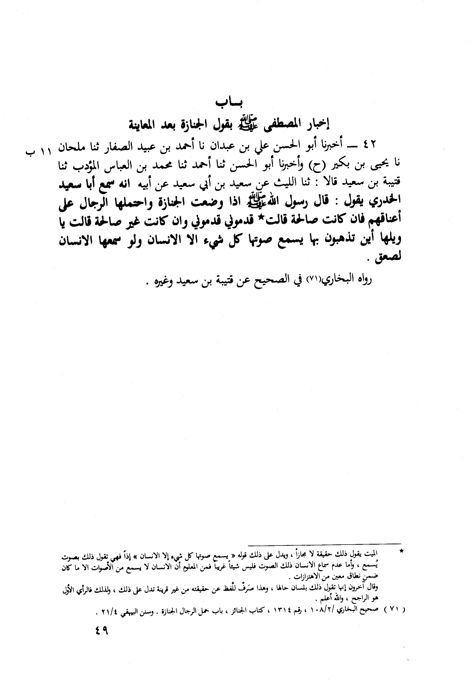 ٤٢ - أَخْبَرَنَا أَبُو الْحَسَنِ عَلِيُّ بْنُ أَحمَدَ بْنُ عَبْدَانَ، نَا أَحْمَدُ بْنُ عُبَيْدٍ الصَّفَّارُ، ثَنَا مِلْحَانُ، نَا يَحْيَى بْنُ بُكَيْرٍ ح، وَأَخْبَرَنَا أَبُو الْحَسَنِ، ثَنَا أَحْمَدُ، ثَنَا مُحَمَّدُ بْنُ الْعَبَّاسِ الْمُؤَدِّبُ، ثَنَا قُتَيْبَةُ بْنُ سَعِيدٍ قَالَا: ثَنَا اللَّيْثُ، عَنْ سَعِيدِ بْنِ أَبِي سَعِيدٍ المَقْبَرِيُّ، عَنْ أَبِيهِ، أَنَّهُ سَمِعَ أَبَا سَعِيدٍ الْخُدْرِيَّ يَقُولُ: قَالَ رَسُولُ اللَّهِ صَلَّى اللَّهُ عَلَيْهِ وَسَلَّم: " إِذَا وُضِعَتِ الْجِنَازَةُ، وَاحْتَمَلَهَا الرِّجَالُ عَلَى أَعْنَاقِهِمْ، فَإِنْ كَانَتْ صَالِحَةً قَالَتْ: قَدِّمُونِي قَدِّمُونِي، وَإِنْ كَانَتْ غَيْرَ صَالِحَةٍ قَالَتْ: يَا وَيْلَهَا أَيْنَ تَذْهَبُونَ بِهَا؟ يَسْمَعُ صَوْتَهَا كُلُّ شَيْءٍ إِلَّا الْإِنْسَانَ، وَلَوْ سَمِعَهَا الْإِنْسَانُ لَصَعِقَ " رَوَاهُ الْبُخَارِيُّ فِي الصَّحِيحِ عَنْ قُتَيْبَةَ بْنِ سَعِيدٍ وَغَيْرِهِ