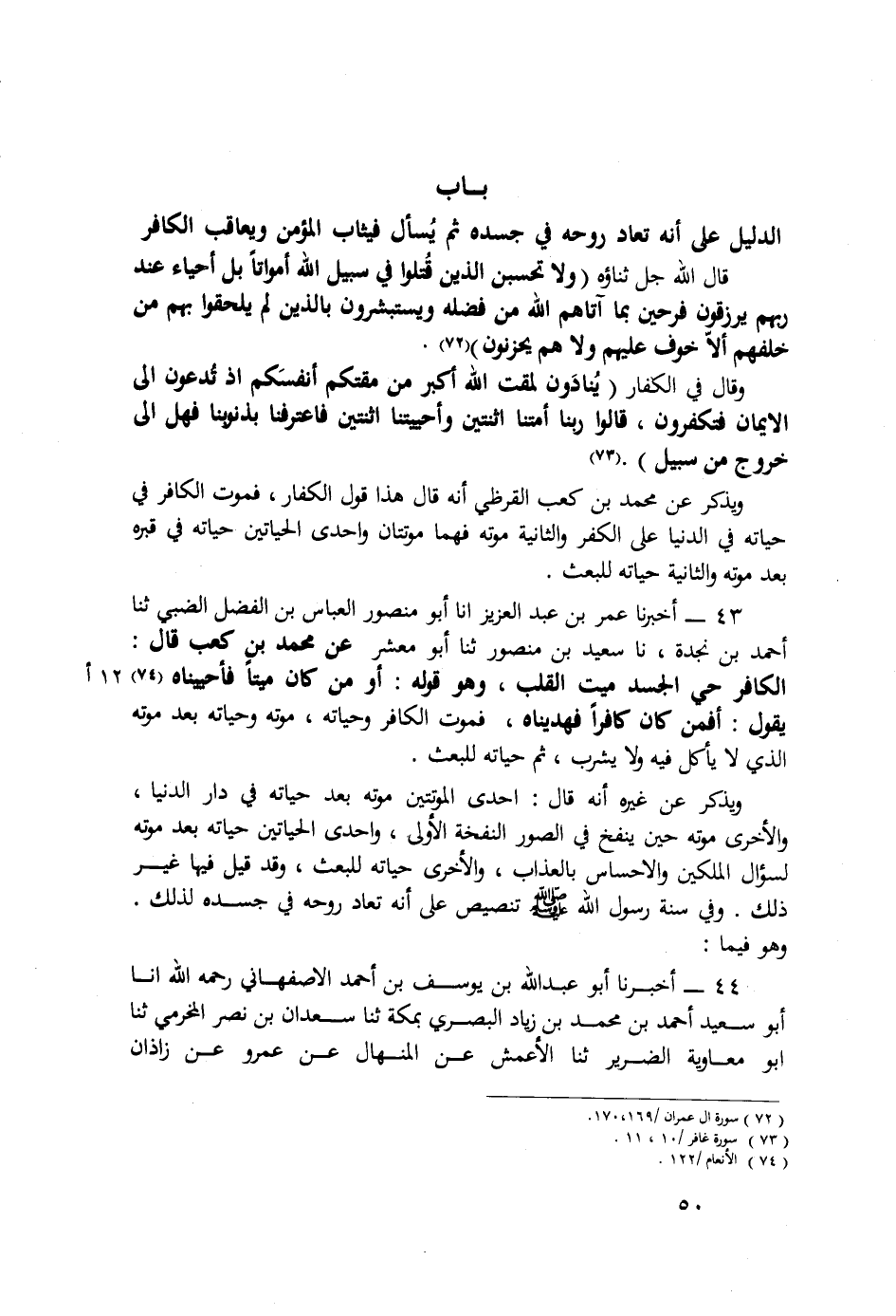 ٤٣ - أَخْبَرَنَاهُ عُمَرُ بْنُ عَبْدِ الْعَزِيزِ، أَنَا أَبُو مَنْصُورٍ الْعَبَّاسُ بْنُ الْفَضْلِ الضَّبِّيُّ، ثَنَا أَحْمَدُ بْنُ نَجْدَةَ، نَا سَعِيدُ بْنُ مَنْصُورٍ، ثَنَا أَبُو مَعْشَرٍ، عَنْ مُحَمَّدِ بْنِ كَعْبٍ قَالَ: " الْكَافِرُ حَيُّ الْجَسَدِ مَيِّتُ الْقَلْبِ وَهُوَ قَوْلُهُ {أَوَ مَنْ كَانَ مَيْتًا فَأَحْيَيْنَاهُ} [الأنعام: ١٢٢] يَقُولُ: أَفَمَنْ كَانَ كَافِرًا فَهَدَيْنَاهُ فَمَوْتُ الْكَافِرِ وَحَيَاتُهُ مَوْتُهُ وَحَيَاتُهُ بَعْدَ مَوْتِهِ الَّذِي لَا يَأْكُلُ فِيهِ وَلَا يَشْرَبُ، ثُمَّ حَيَاتُهُ لِلْبَعْثِ "، وَيُذْكَرُ عَنْ غَيْرِهِ أَنَّهُ قَالَ: «إِحْدَى الْمَوْتَتَيْنِ مَوْتَةٌ بَعْدَ حَيَاتِهِ فِي دَارِ الدُّنْيَا وَالْأُخْرَى مَوْتَةٌ حِينَ يُنْفَخُ فِي الصُّورِ النَّفْخَةُ الْأُولَى وَإِحْدَى الْحَيَاتَيْنِ حَيَاتُهُ بَعْدَ مَوْتِهِ لِسُؤَالِ الْمَلَكَيْنِ وَالْإِحْسَاسِ بِالْعَذَابِ وَالْأُخْرَى حَيَاتُهُ لِلْبَعْثِ» ، وَقَدْ قِيلَ فِيهَا غَيْرُ ذَلِكَ، وَفِي سُنَّةِ رَسُولِ اللَّهِ صَلَّى اللَّهُ عَلَيْهِ وَسَلَّم تَنْصِيصٌ عَلَى أَنَّهُ تُعَادُ رُوحُهُ فِي جَسَدِهِ لِذَلِكَ وَهُوَ فِيمَا