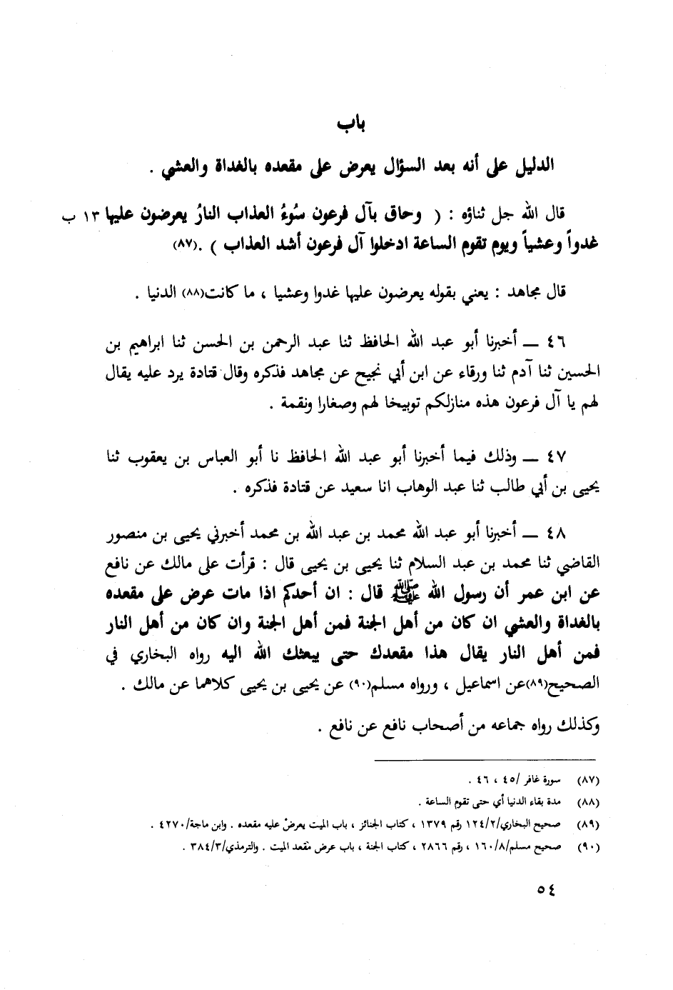 بَابُ الدَّلِيلِ عَلَى أَنَّهُ بَعْدَ السُّؤَالِ يُعْرَضُ عَلَى مَقْعَدِهِ بِالْغَدَاةِ وَالْعَشِيِّ قَالَ اللَّهُ جَلَّ ثَنَاؤُهُ {وَحَاقَ بِآلِ فِرْعَوْنَ سُوءُ الْعَذَابِ النَّارُ يُعْرَضُونَ عَلَيْهَا غُدُوًّا وَعَشِيًّا وَيَوْمَ تَقُومُ السَّاعَةُ أَدْخِلُوا آلَ فِرْعَوْنَ أَشَدَّ الْعَذَابِ} [غافر: ٤٦]